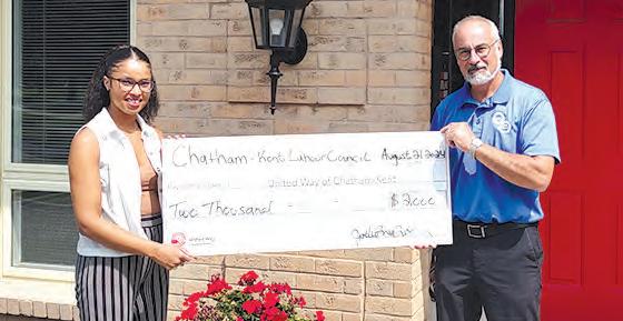 Eric Ricciotti (right), treasurer of the CKLC, is shown making a donation to Joelle Brown-Detailleur, relationship manager, United Way Centraide Windsor-Essex Chatham-Kent’s BaCK to School Program. The program includes a family gift card of $50 in which a family can use for school supplies and also $300 towards the Teachers Tote Program which aides teachers prepare for school.