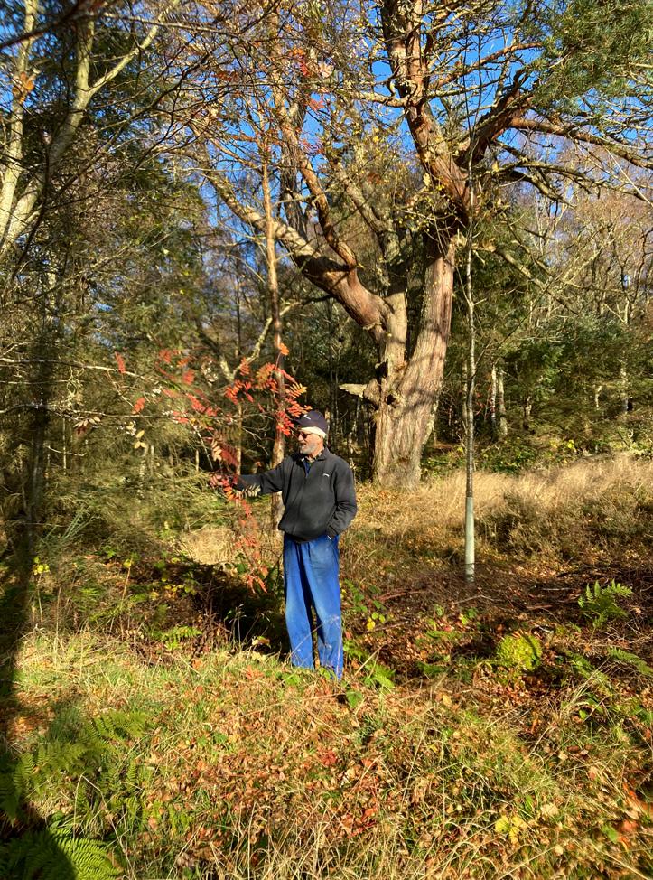 Graham Tuley – turned dank woodland into a place to visit. One of his tubes can be seen protecting the sapling behind him.