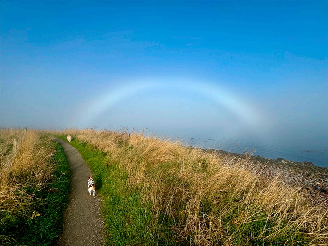 On Wednesday morning, 18th september, when we were experiencing some very warm early autumn sunshine, I took the dogs for a walk along the sutor Path next to the Reeds Park Loop in Cromarty. It was a misty morning and the sun was trying to burn off the haar that obscured the view across the Firth. as I turned to walk back towards the town, a bright arc of light appeared ahead of me, much smaller than a rainbow and with no colour. I knew that this was a rare sighting of a fogbow, known also as Ghost Rainbows, White Rainbows or, to sailors, sea Dogs. It was something I had long wanted to see, having ticked off the Broken spectre and Glory – two other ghostly images caused by the direction of light on clouds.