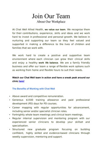 At Chat Well Allied Health, we value our team. We recognise them for their contributions, experience, skills and ideas and we work hard to invest in professional and personal growth. We believe in nurturing and supporting our team so they feel valued and supported in making a difference to the lives of children and families that we work with.