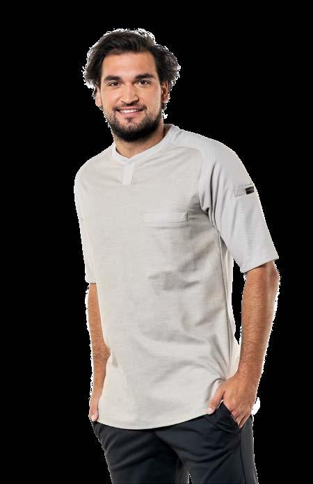 La libertad es la máxima prioridad en la colección FX. Hemos optado por tejidos ligeros, con o sin estructura. El delicado tejido jersey ofrece la máxima flexibilidad. Este tejido está compuesto por Tencel® y poliéster reciclado de botellas de plástico. Esta combinación de materiales no sólo es respetuosa con el medio ambiente, sino que además permite que el tejido se seque con rapidez. Manga corta, tres cuartos o remangable: elije el modelo que más te conviene. De este modo, te mantendrás con facilidad en la cocina.