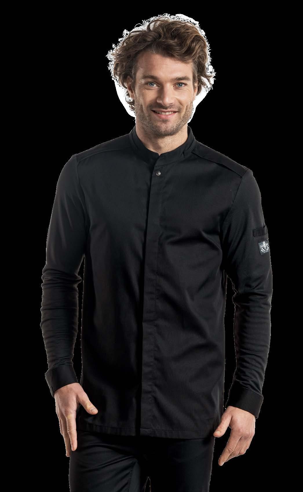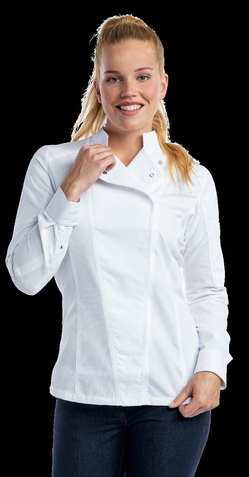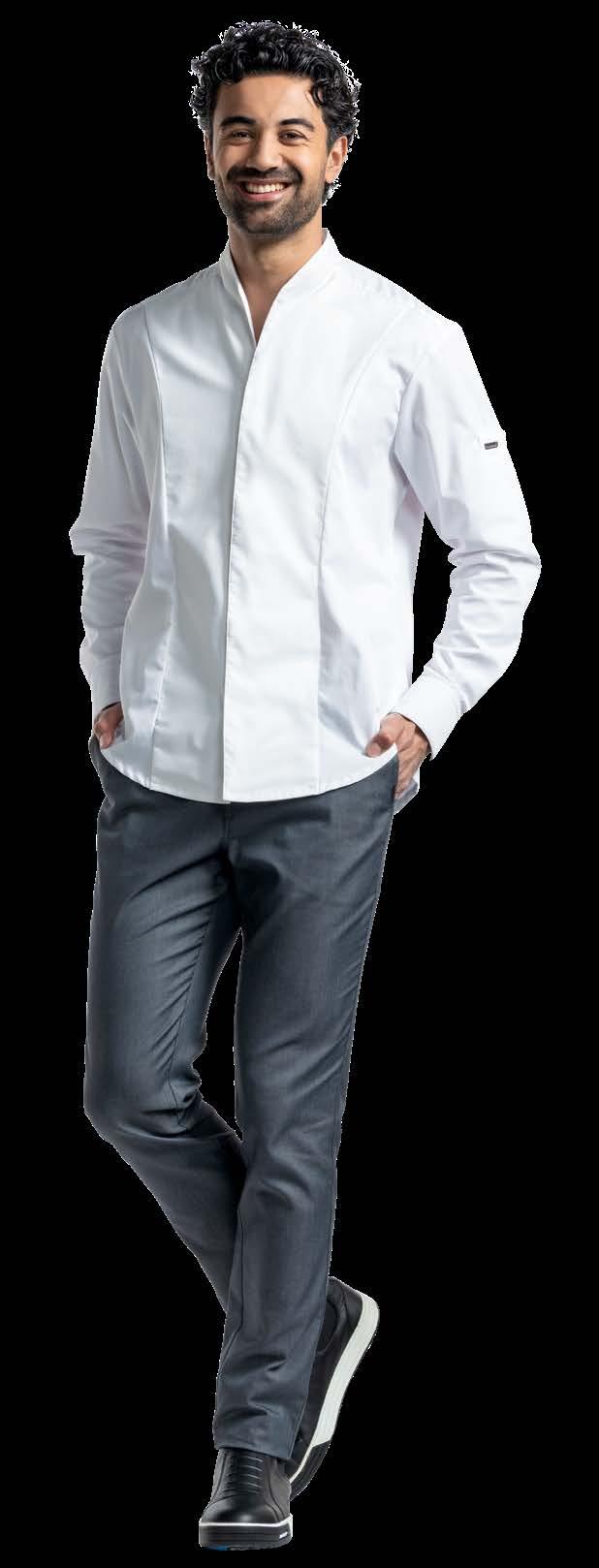 Freedom of movement is the most prominent feature of the FX collection. The entire collection is made of lightweight fabrics, both with and without texture. The fine jersey fabric guarantees unlimited flexibility. This fabric is made of Tencel® and polyester produced from recycled plastic bottles. The combination of these materials is not only environmentally friendly, but also ensures that the fabric dries quickly. Whether you prefer short, half-length or rollup sleeves, the collection has it all. Make every day in the kitchen a comfortable day!