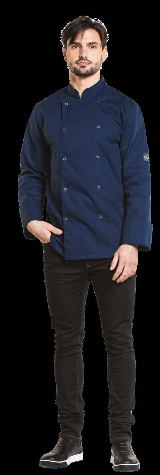 The double-stitched seams with slanting zippers make today’s chef feel like a biker. The adjustable, inside-out zipper is protected from daily wear and tear. This jacket is practical, functional and gives you that same cool feeling as if you were wearing a motorcycle jacket.