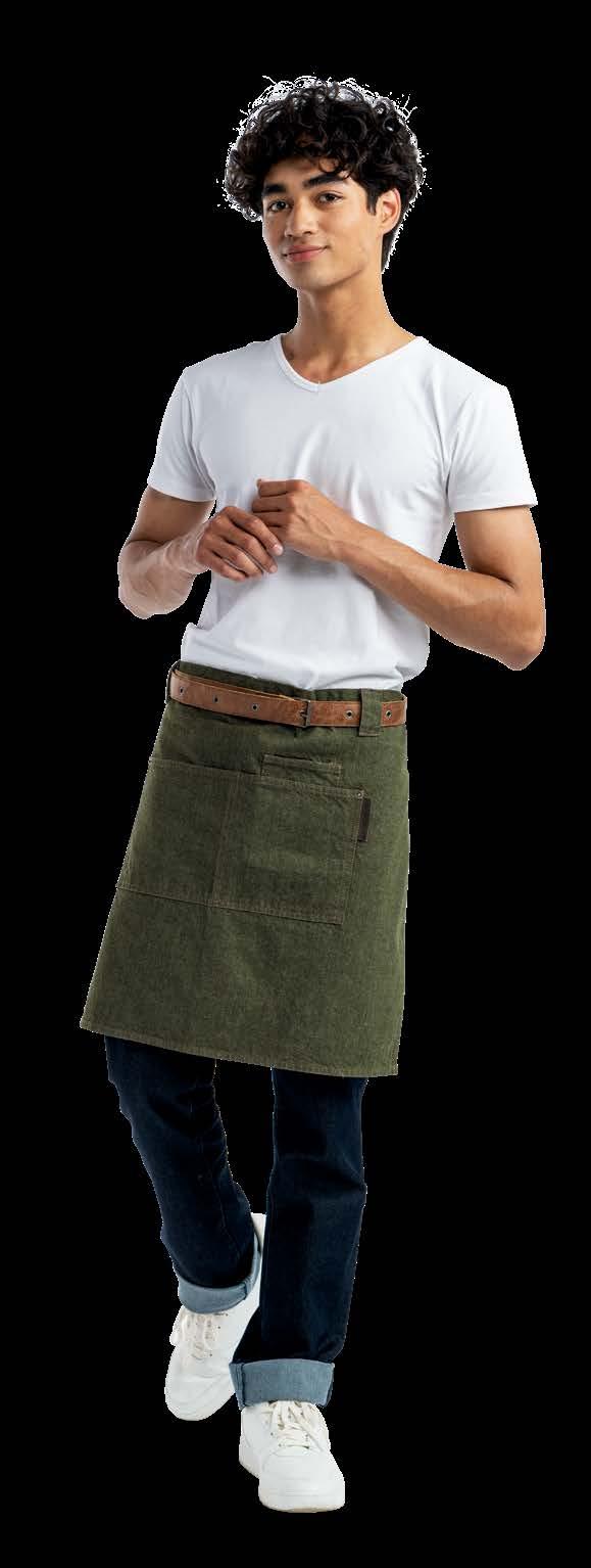 Authentic, lightweight and timeless. From bistro to food truck or trendy bar, the Leather70 collection fits in anywhere. The innovative combination of cowhide and polyester makes the leather bib and waist aprons lightweight and less vulnerable to stains. All of the apron ties are fully adjustable. The ‘raw edgesingle stitch’ finish gives the collection its recognizable, tough appearance.