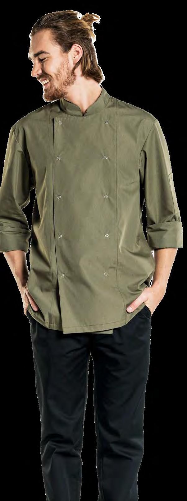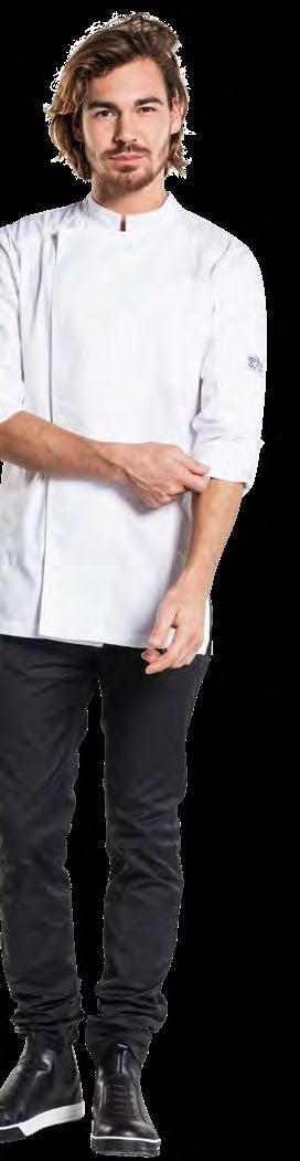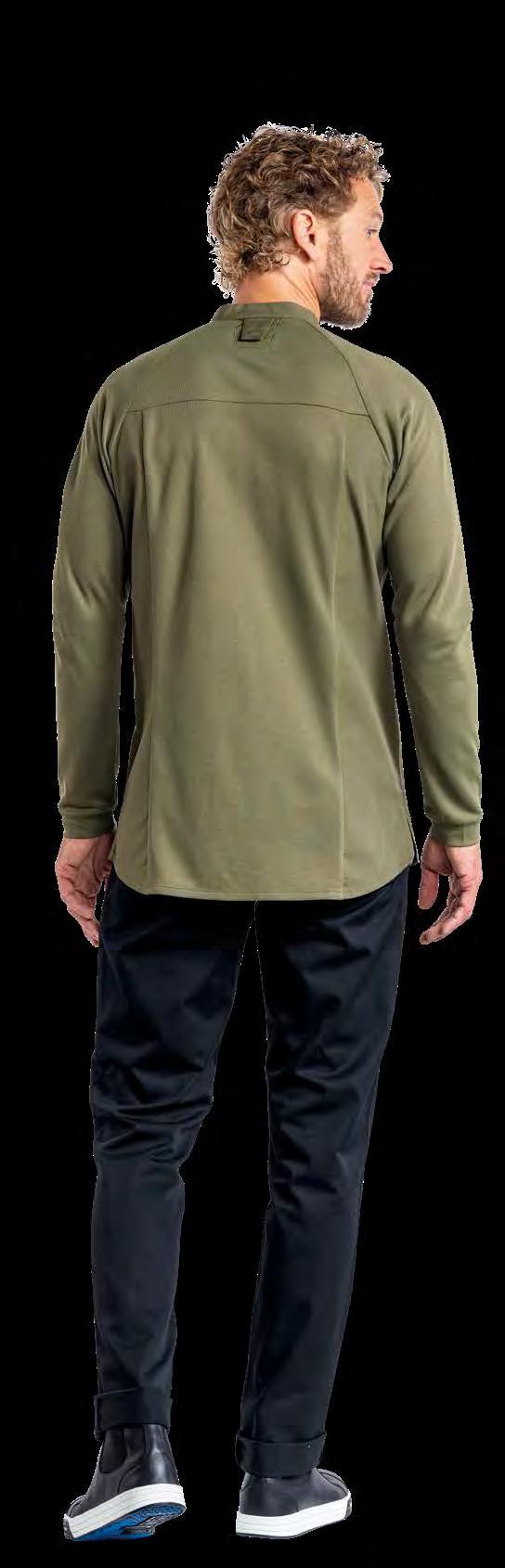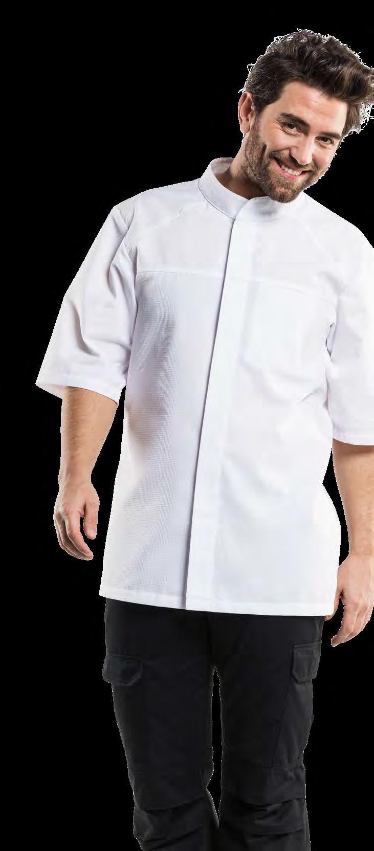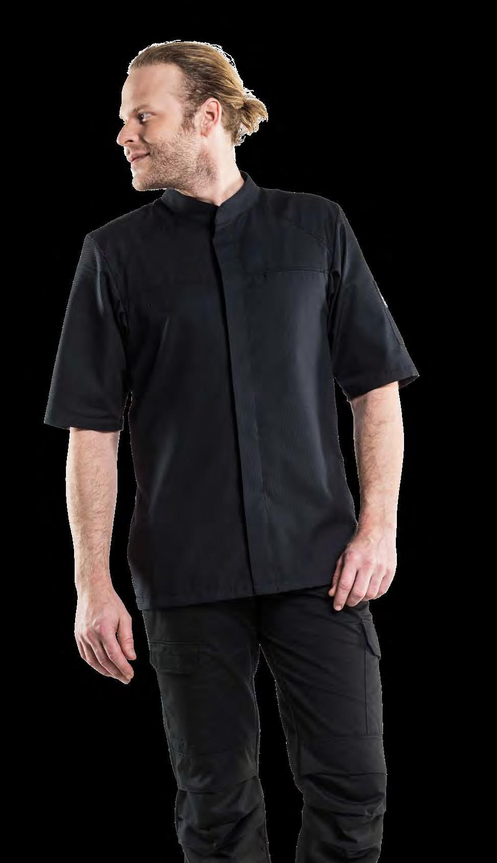 La libertad es la máxima prioridad en la colección FX. Hemos optado por tejidos ligeros, con o sin estructura. El delicado tejido jersey ofrece la máxima flexibilidad. Este tejido está compuesto por Tencel® y poliéster reciclado de botellas de plástico. Esta combinación de materiales no sólo es respetuosa con el medio ambiente, sino que además permite que el tejido se seque con rapidez. Manga corta, tres cuartos o remangable: elije el modelo que más te conviene. De este modo, te mantendrás con facilidad en la cocina.