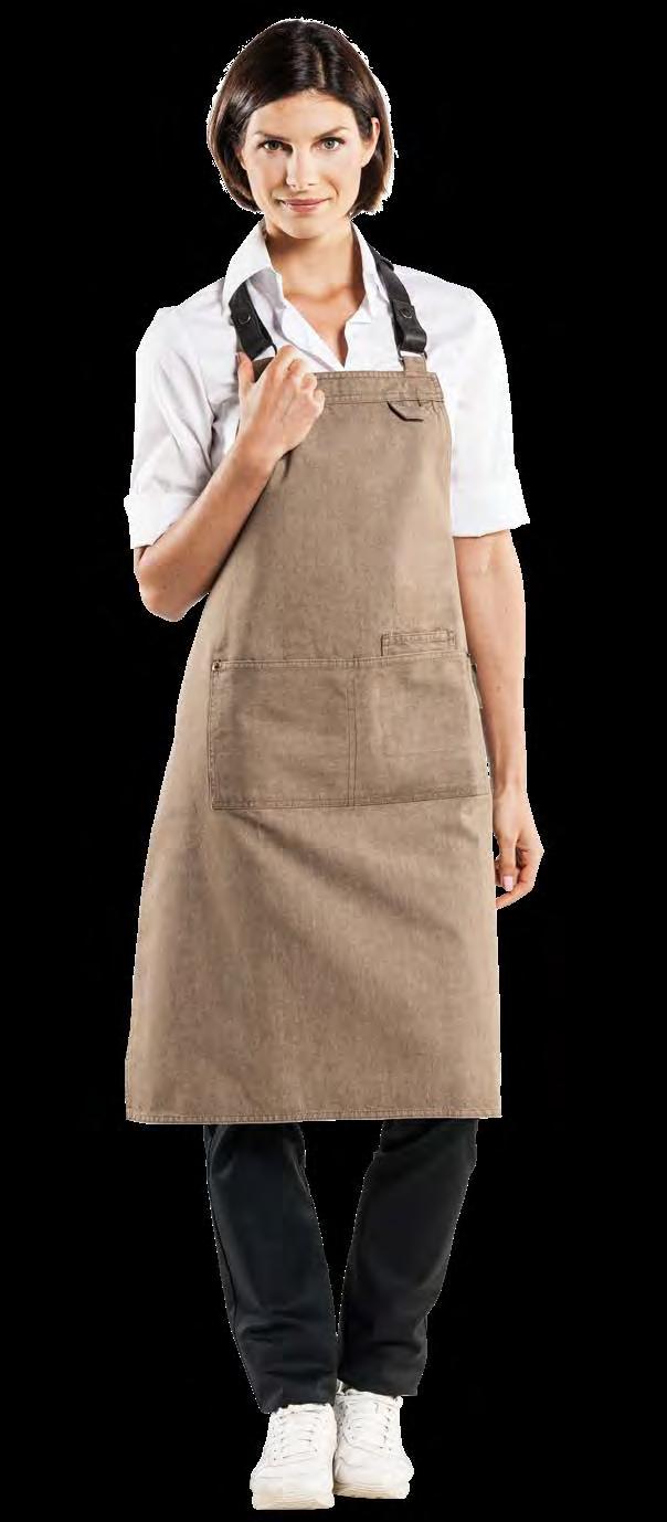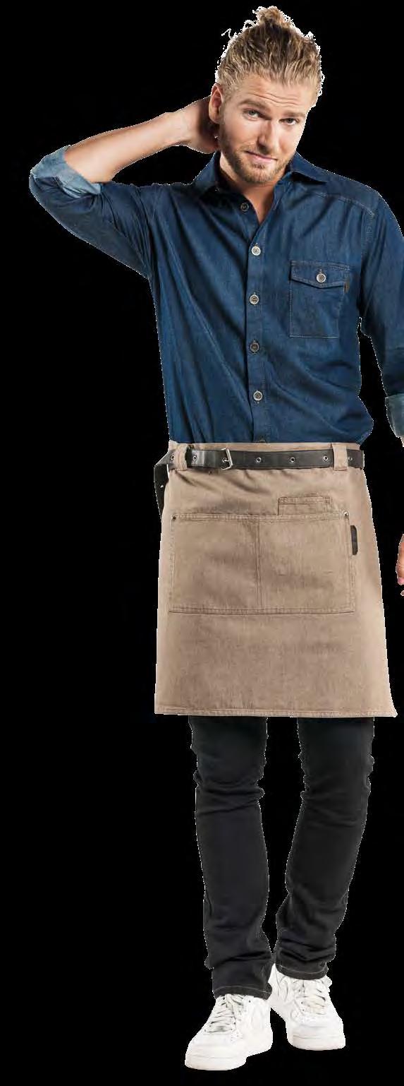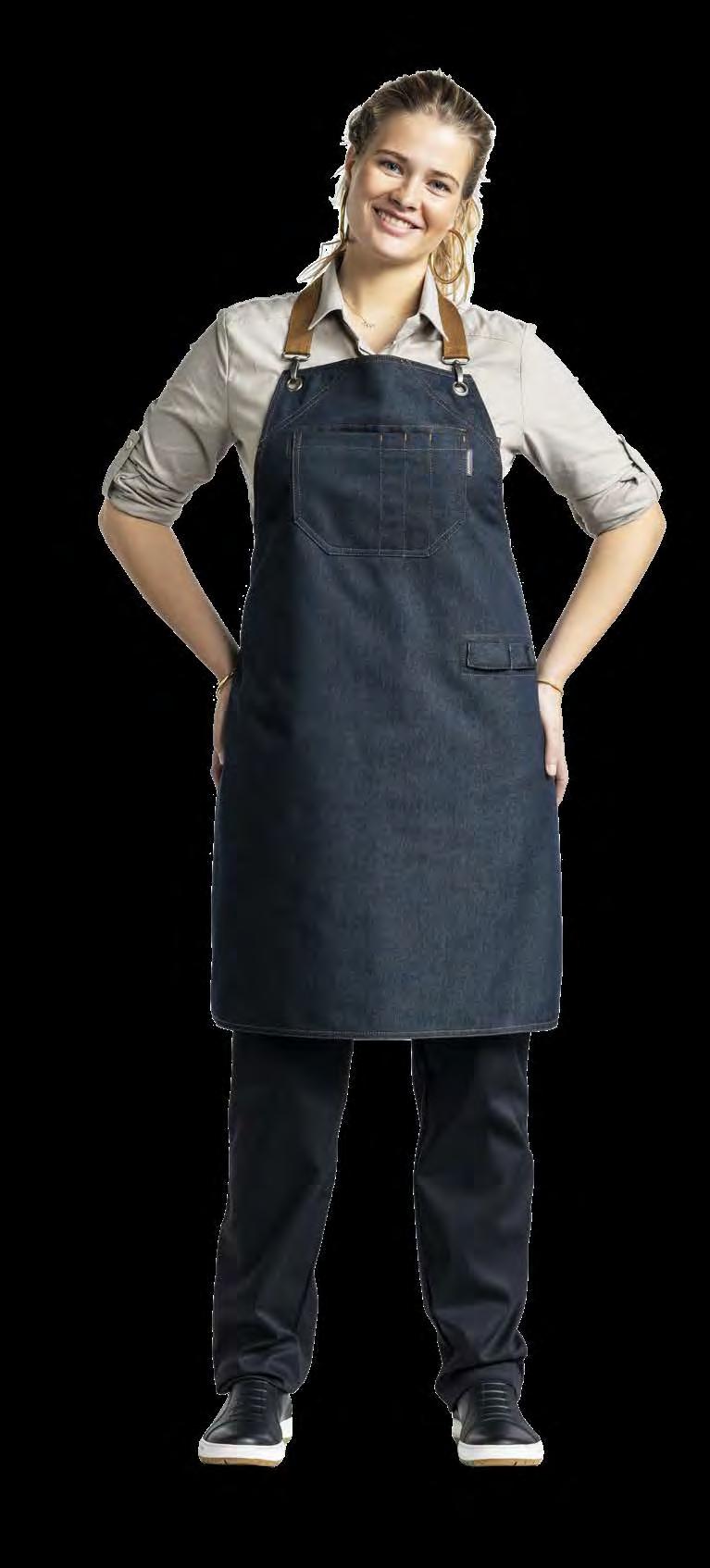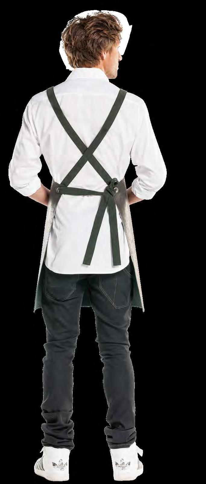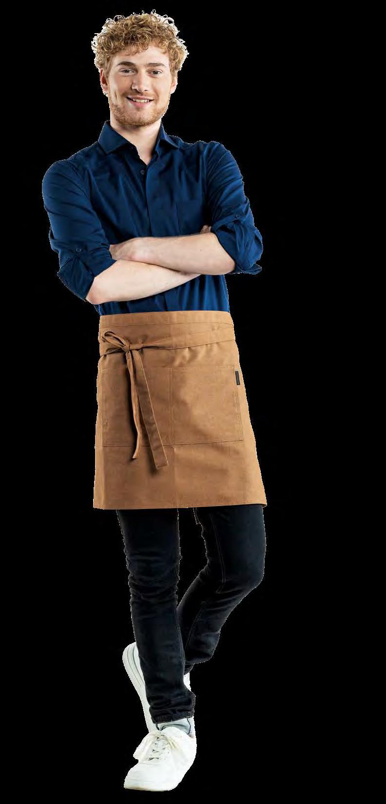 Auténtica, ligera y atemporal. Desde bistro, camiones de comida hasta bar moderno, la colección Cuero se siente principalmente hogareña. La innovadora combinación de cuero de bovino y poliéster hace que los delantales de cuero con peto y sin peto sean ligeros y menos propensos a las manchas. Todas las cintas son ajustables y se adaptan a la talla deseada. El acabado con ‘borde sólido - pespunte único’ le da esa imagen desenfadada conocida.