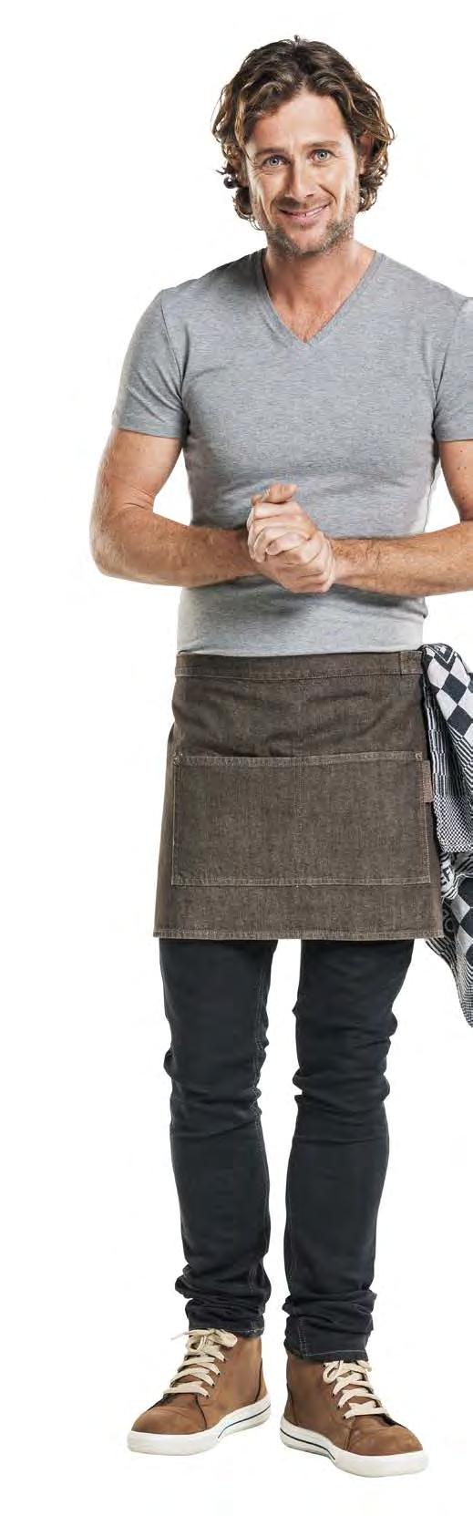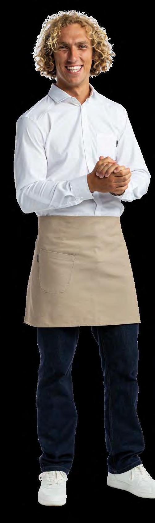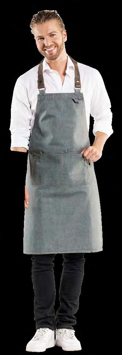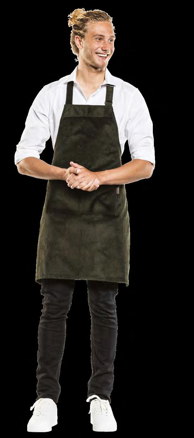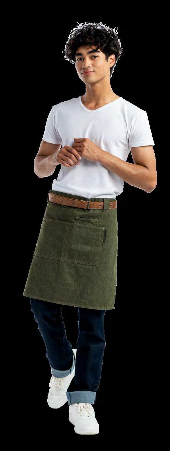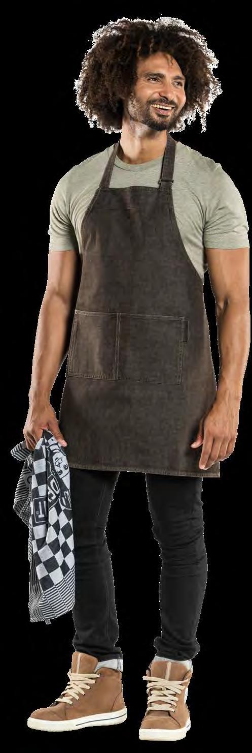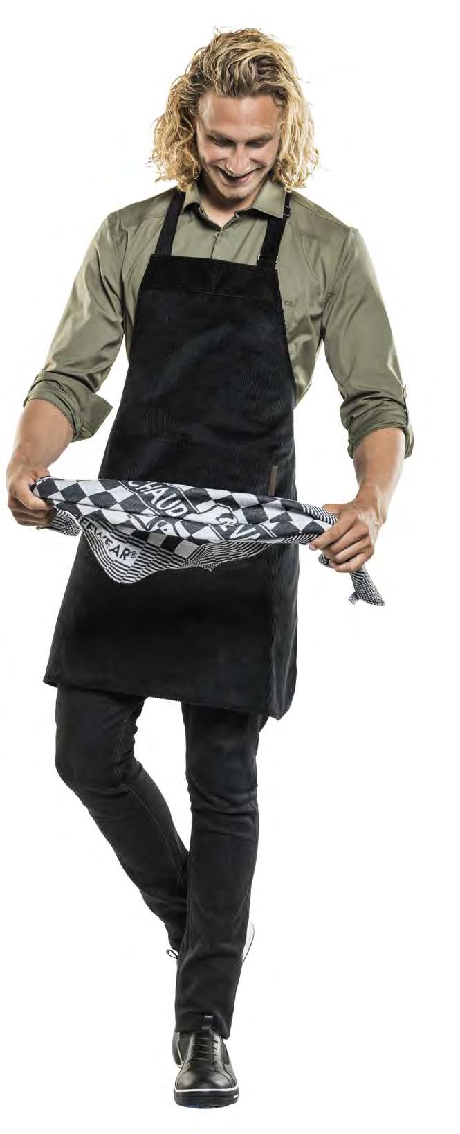 Auténtica, ligera y atemporal. Desde bistro, camiones de comida hasta bar moderno, la colección Cuero se siente principalmente hogareña. La innovadora combinación de cuero de bovino y poliéster hace que los delantales de cuero con peto y sin peto sean ligeros y menos propensos a las manchas. Todas las cintas son ajustables y se adaptan a la talla deseada. El acabado con ‘borde sólido - pespunte único’ le da esa imagen desenfadada conocida.
