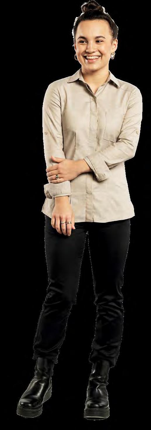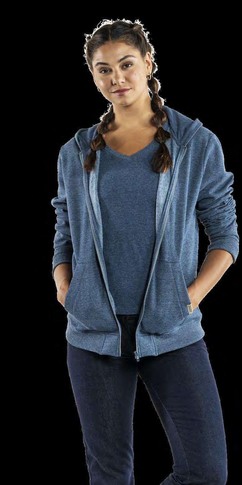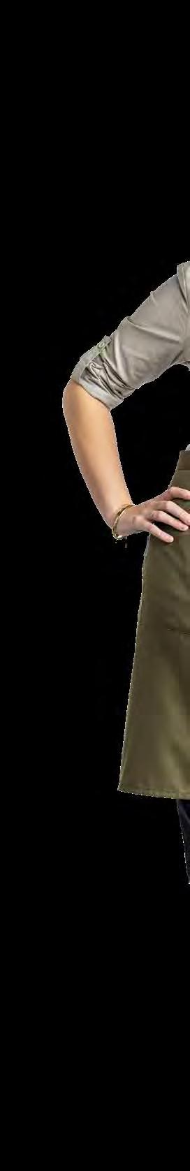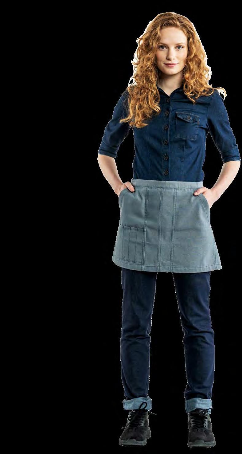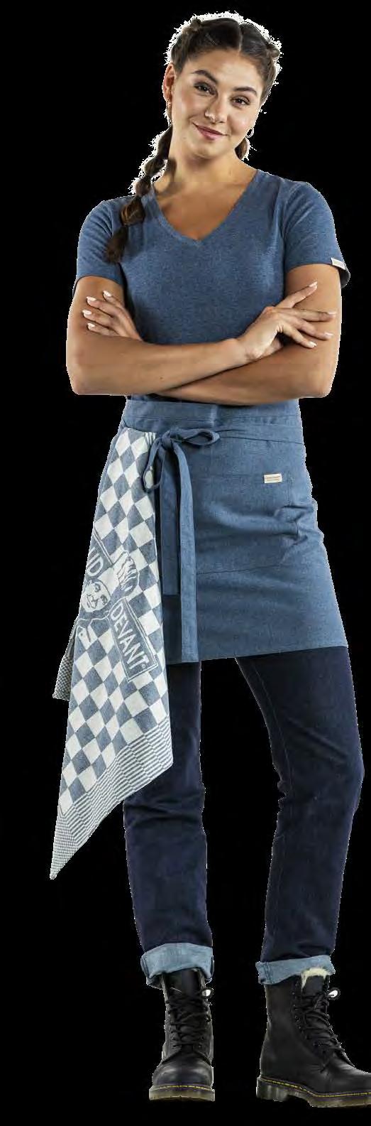 verminderen en een circulaire economie binnen onze industrie te bevorderen. Hiervoor hebben we de Recycled Chefwear-lijn ontwikkeld, gemaakt van hoogwaardige gerecyclede materialen. Deze kledinglijn wordt gecreëerd door teruggestuurde horeca-textiel af te breken en te combineren met andere gerecyclede vezels. De stofsamenstelling bestaat uit 15% gerecyclede horeca-textiel, 52% gerecycled PET-polyester en 33% gerecycled katoen. De veelzijdige, circulaire collectie omvat items zoals witte koksbuizen, schorten, sloven en T-shirts in een elegante blauwgrijze tint genaamd Blue Melêe.