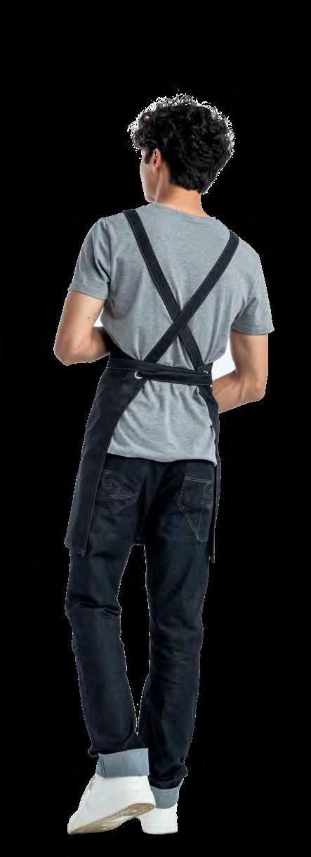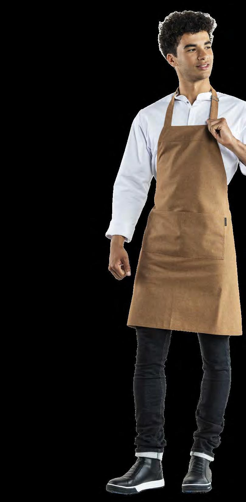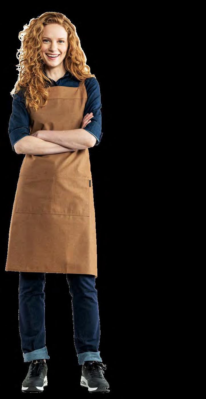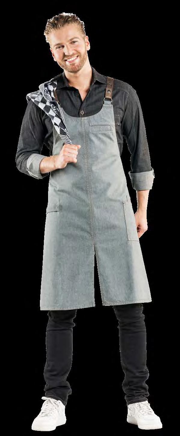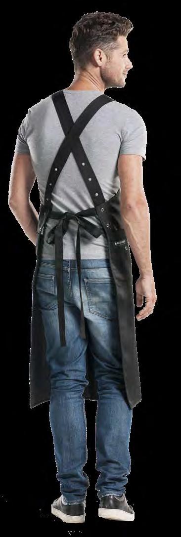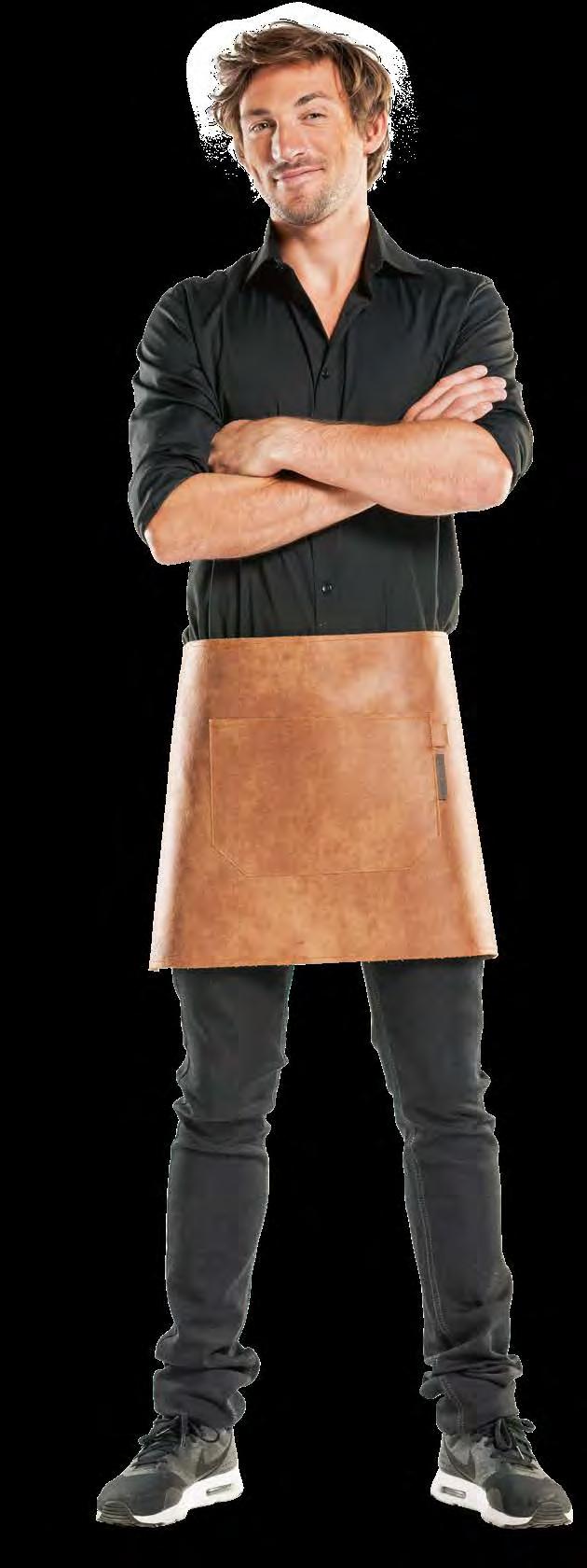 Authentiek, lichtgewicht en tijdloos. Van bistro, foodtruck tot trendy bar, de Leather 70-collectie voelt zich overal thuis. De innovatieve combinatie van rundleer en polyester maakt de leren schorten en sloven licht en minder kwetsbaar voor vlekken. Alle banden zijn op maat te verstellen. De ‘raw edge - single stitch’ afwerking geeft de collectie de herkenbare, stoere uitstraling.