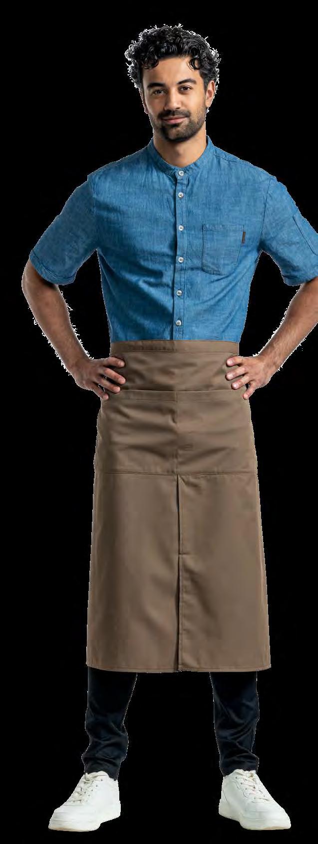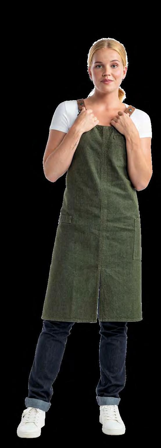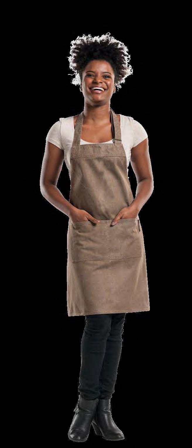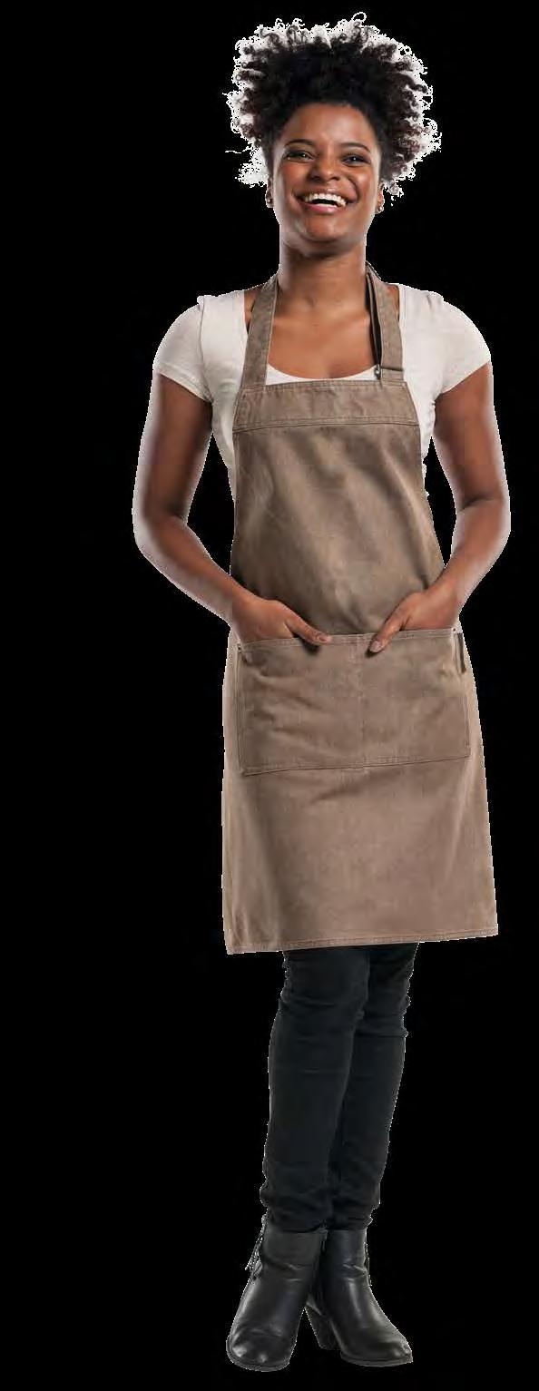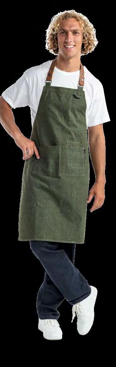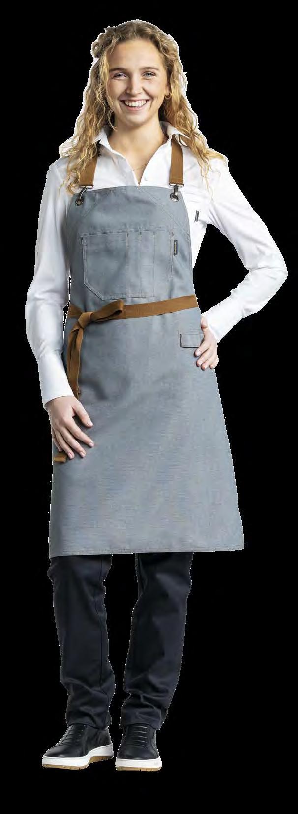 Authentiek, lichtgewicht en tijdloos. Van bistro, foodtruck tot trendy bar, de Leather 70-collectie voelt zich overal thuis. De innovatieve combinatie van rundleer en polyester maakt de leren schorten en sloven licht en minder kwetsbaar voor vlekken. Alle banden zijn op maat te verstellen. De ‘raw edge - single stitch’ afwerking geeft de collectie de herkenbare, stoere uitstraling.