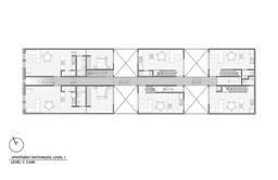 The apartments vary with three level units with rooftops, and one level spaces with gardens on the first floor, all of them interlocking in a complex distribution achieving the maximum efficiency of space and minimizing circulation that results in more usable interior space for its end users. Mixing family homes as well as single room flats also allows for a rich social network, enriching the community and in the end the lifestyle of whomever lives in.