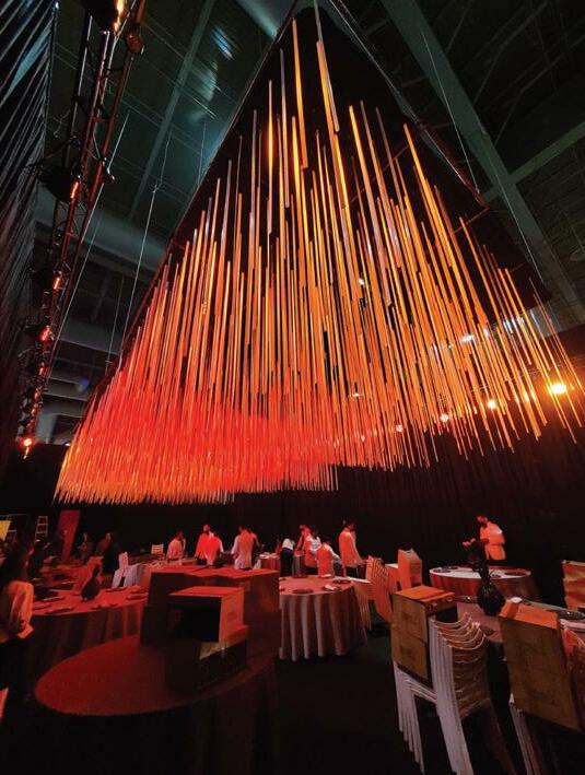 The entire restaurant measures 200 m2 (2152.78 ft2) in area. In addition to the starry sky, guests can also experience the otherworldly theme thanks to the bookcase at the entrance, where a number of books are suspended from the ceiling, giving the impression of anti-gravity, and referencing the movie plot. The ephemeral IINTERSTELLAR restaurant has been built as part of Millesime GNP Mexico 2019 – an interactive haute cuisine event that unites the worlds best chefs along with the best designers, for a threeday gastronomical and design driven experience.