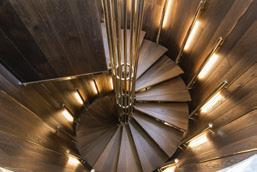 The marble ceiling descends until it almost reaches the floor in order to receive the spiral staircase that connects the ground floor with the terrace. On the right side, there is a sushi bar that allows the user to see the chef’s hands while preparing the sushi through the reflective qualities of the high polished brass ceiling. On the other side, lies a continuous seat with an art piece of artist Marco Rountree located on the wall.