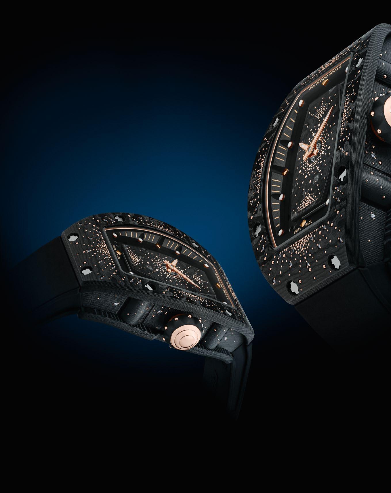 RM 07-01 INTERGALACTIQUE Calibre maison squeletté à remontage automatique Réserve de marche de 50 heures (± 10 %) Platine et ponts en titane grade 5 Rotor à géométrie variable Boîtier en Carbone TPT® serti de diamants et clous en or rouge 5N Cadran central en Carbone TPT® serti de clous en or rouge 5N * L A P E R F O R M A N C E M É C A N I Q U E P O U S S É E À L E X T R Ê M E