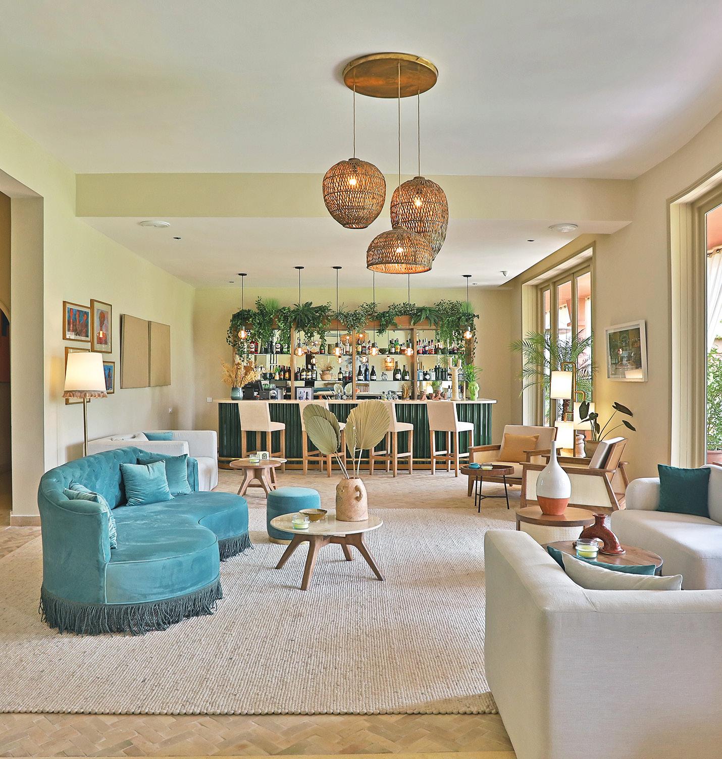 La piscine chauffée à 29 °C toute l’année, avec ses matelas, ses lits et ses palmiers. Ci-dessous, une vue du bar de l’hôtel, à la décoration sobre et élégante.