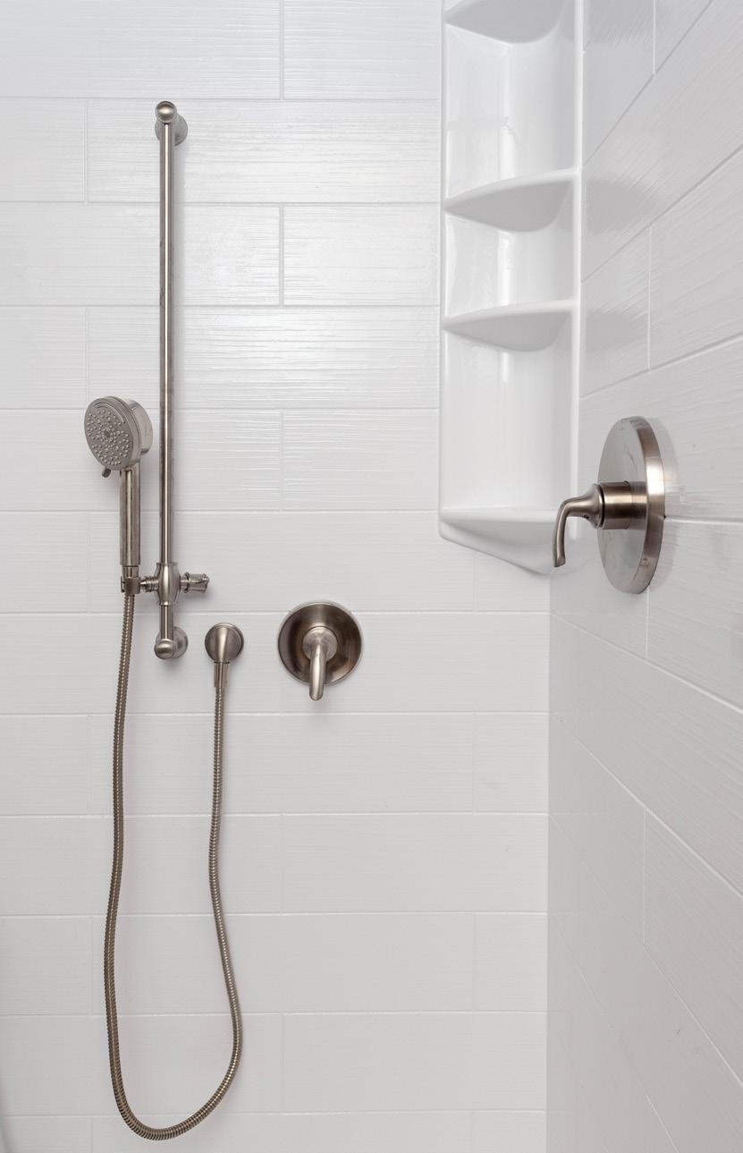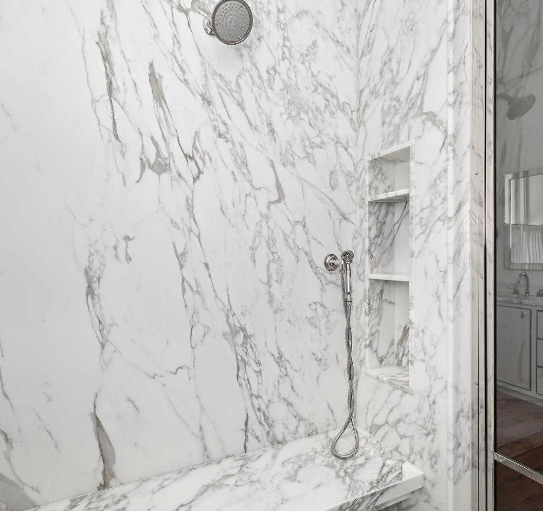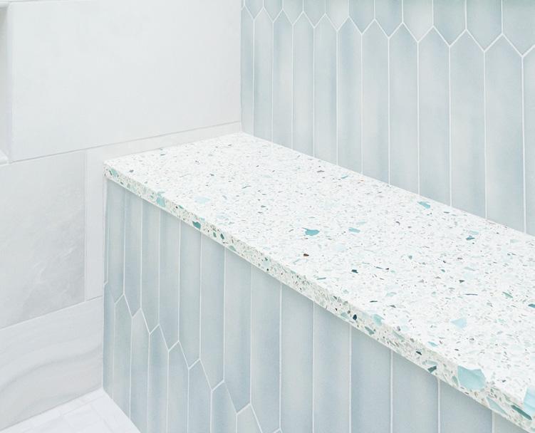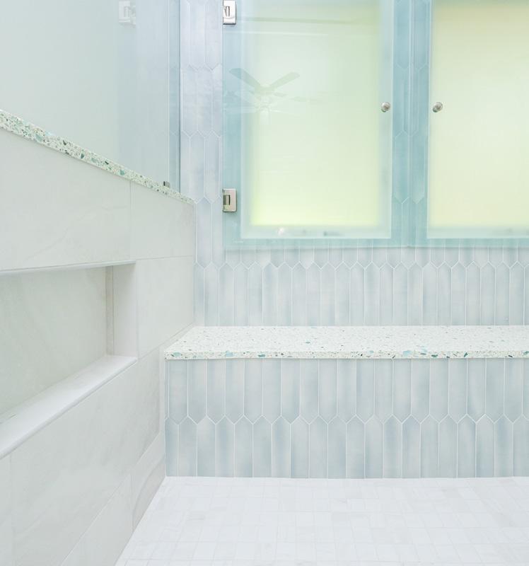 Locally sourced and fabricated, engineered stone makes a stunning impact in this custom shower installed with a patented custom, groutless shower base, a mitered bench and shower walls with a niche for storage.