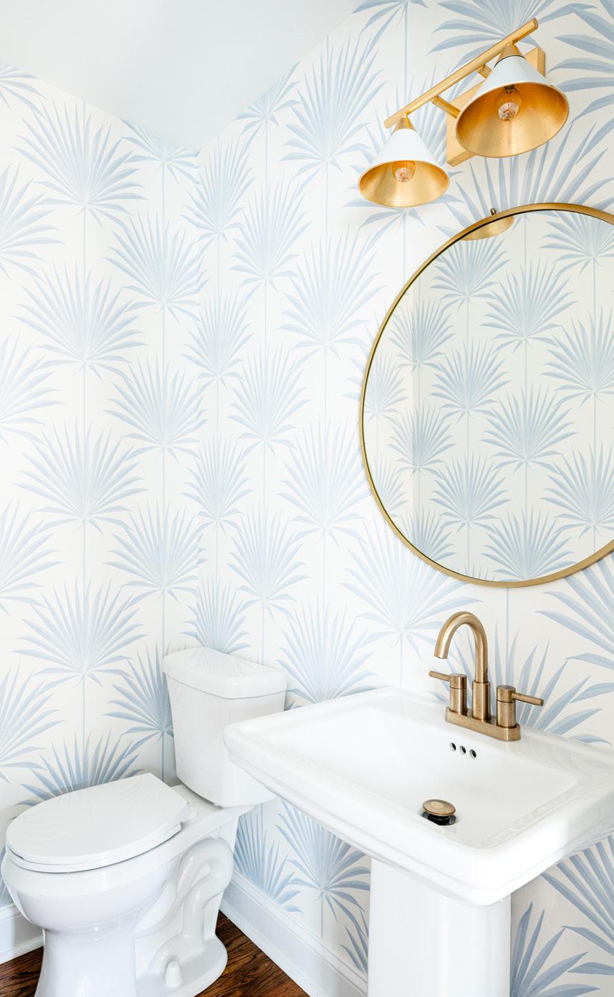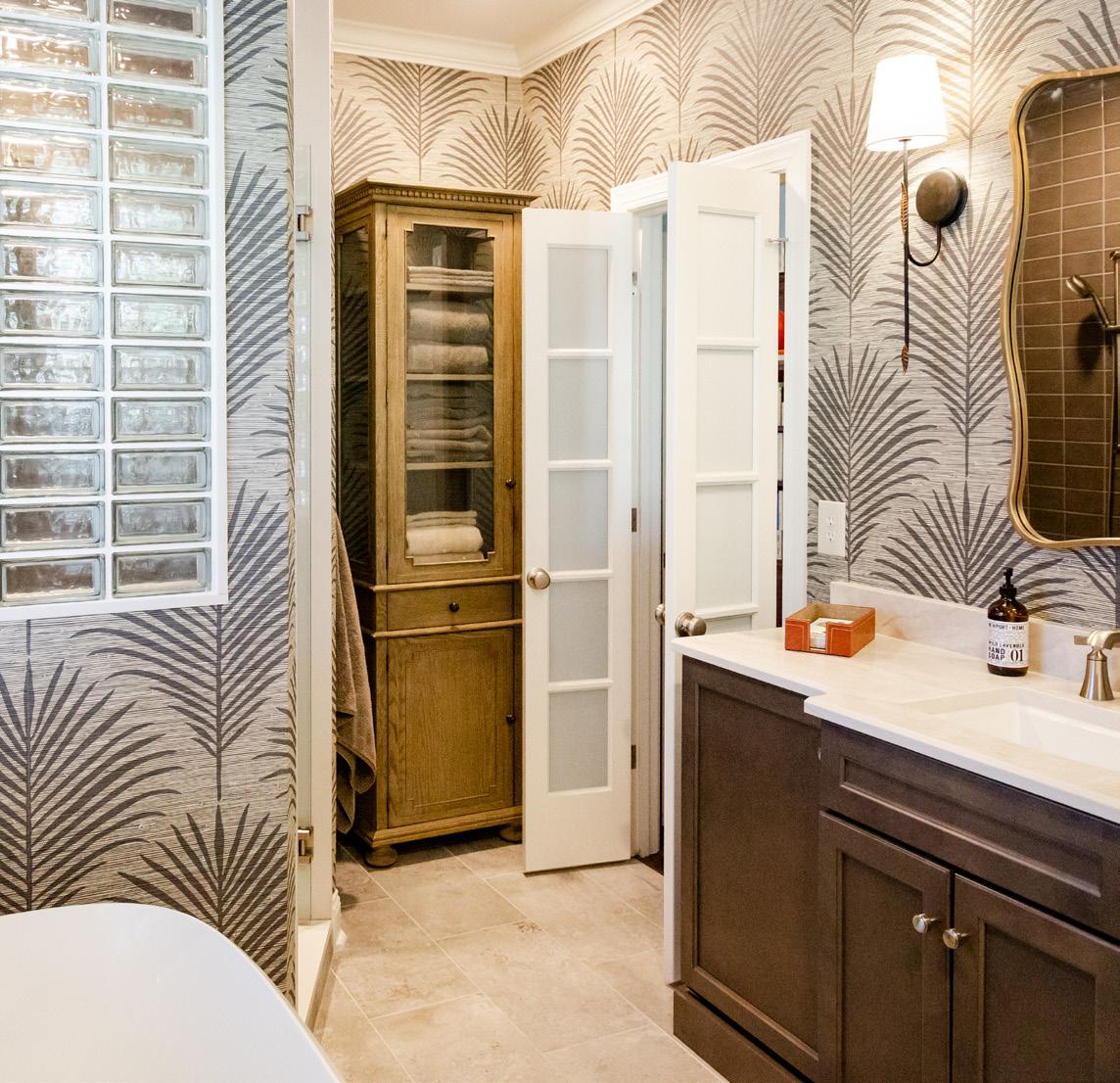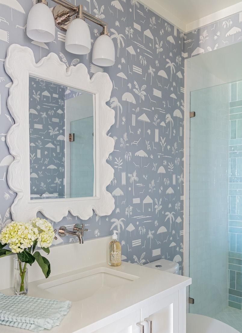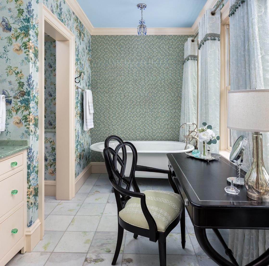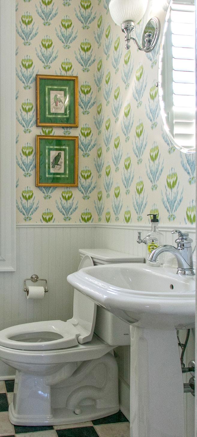 Designed by Randolph Cooper, this bathroom was transformed with a new desk and chair, light fixtures, and Thibaut wallpaper sourced from Southeastern Galleries.