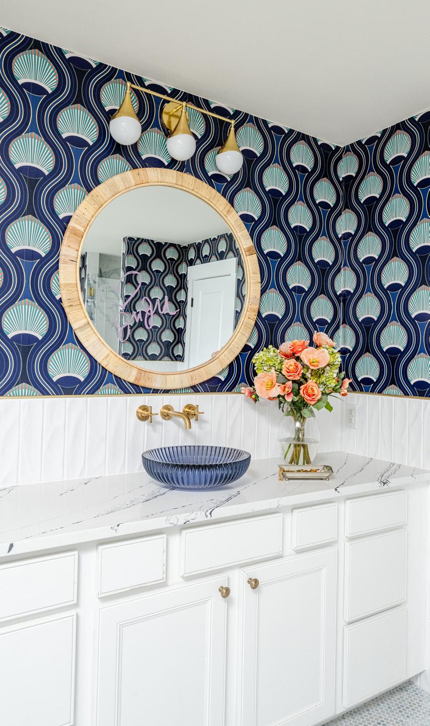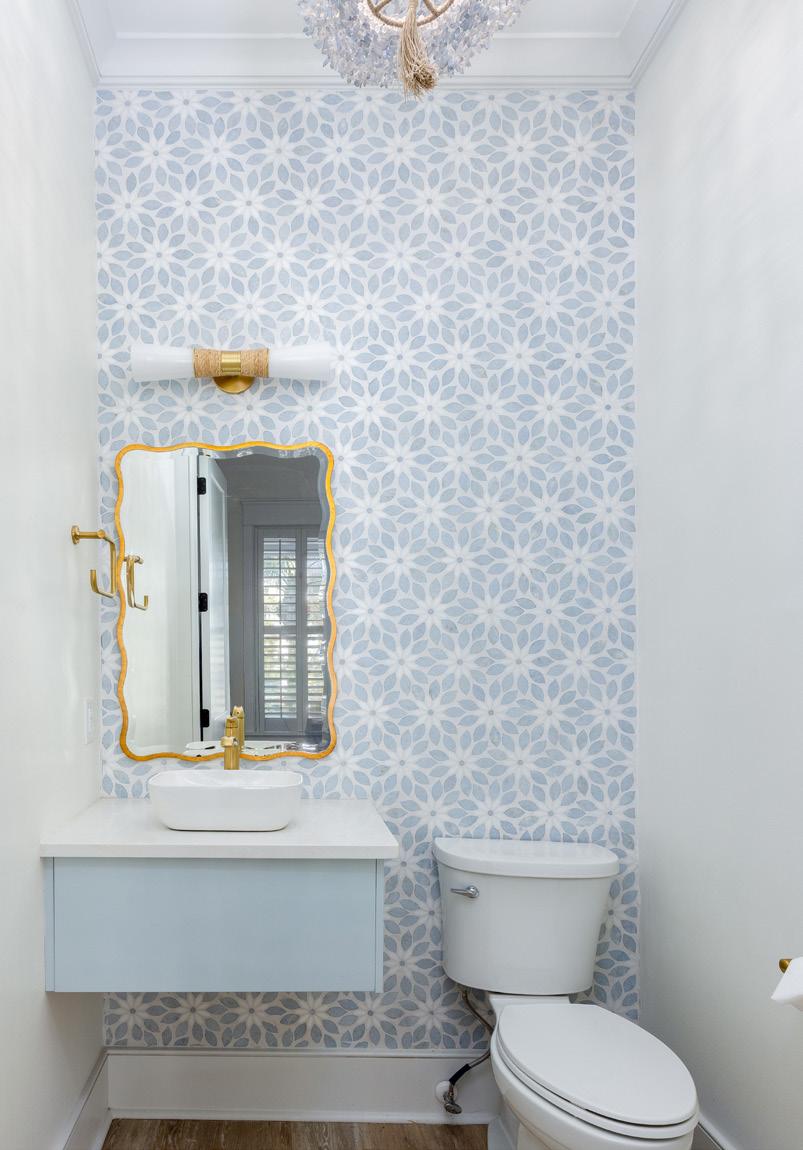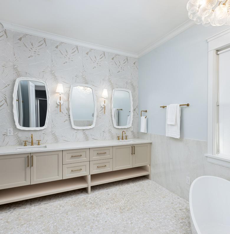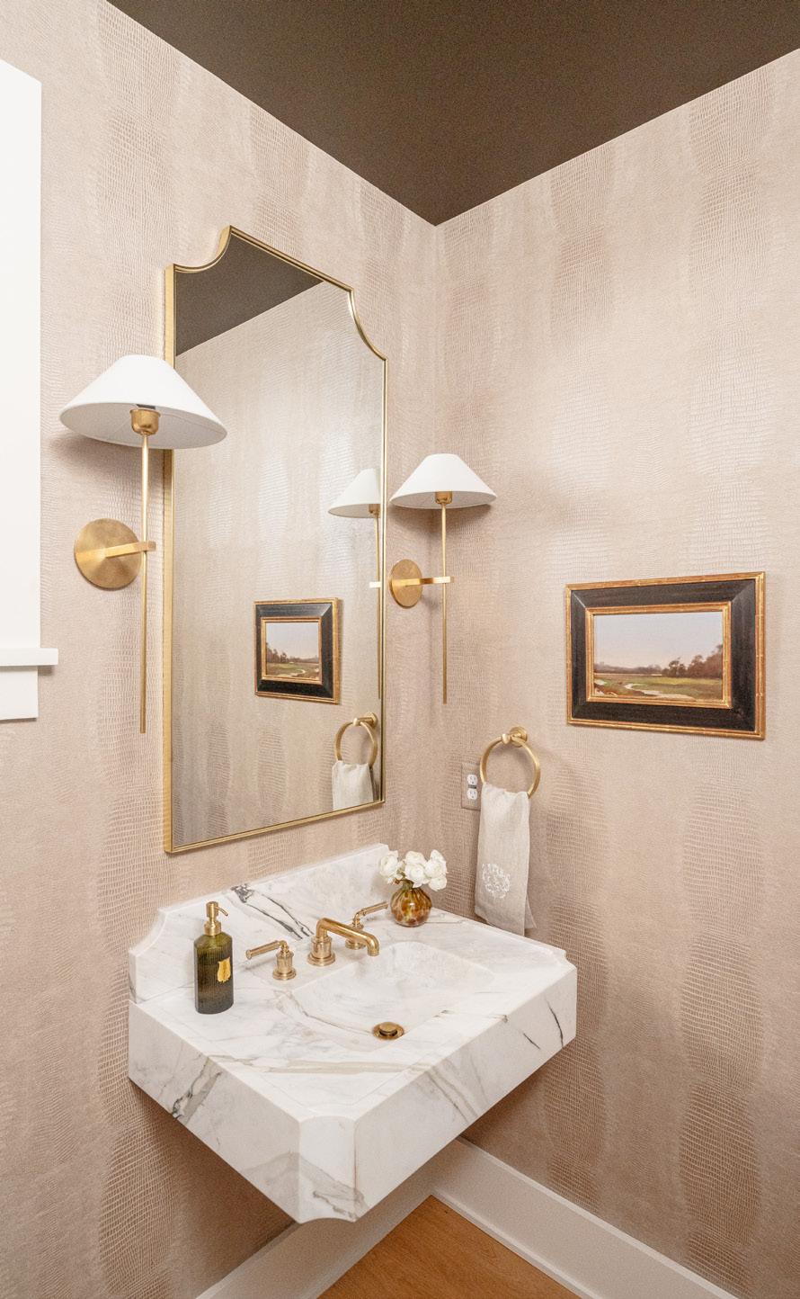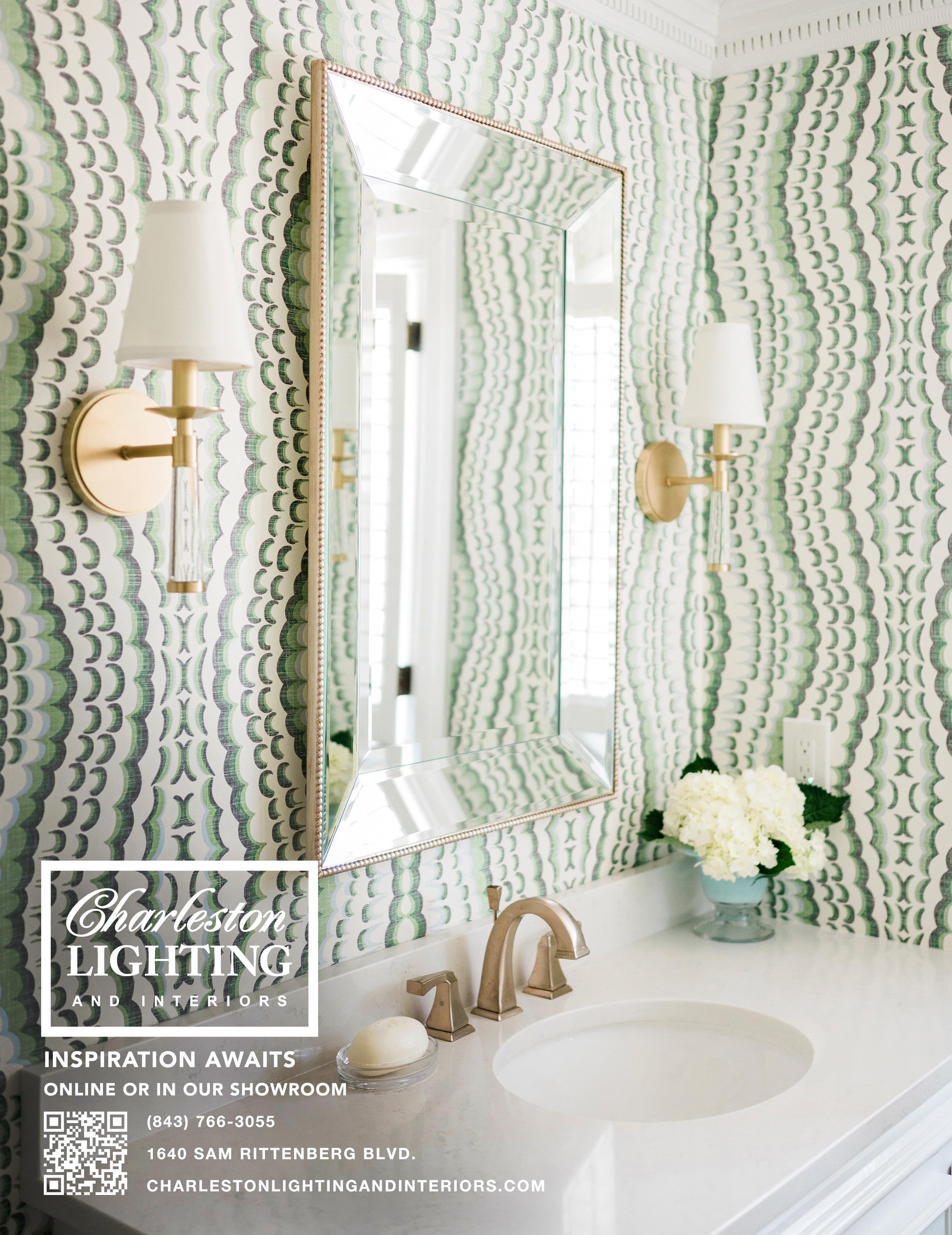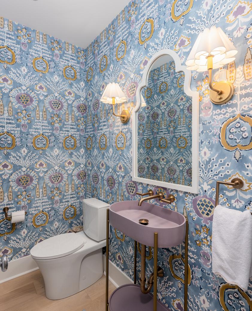 Designed by Randolph Cooper, this bathroom was transformed with a new desk and chair, light fixtures, and Thibaut wallpaper sourced from Southeastern Galleries.
