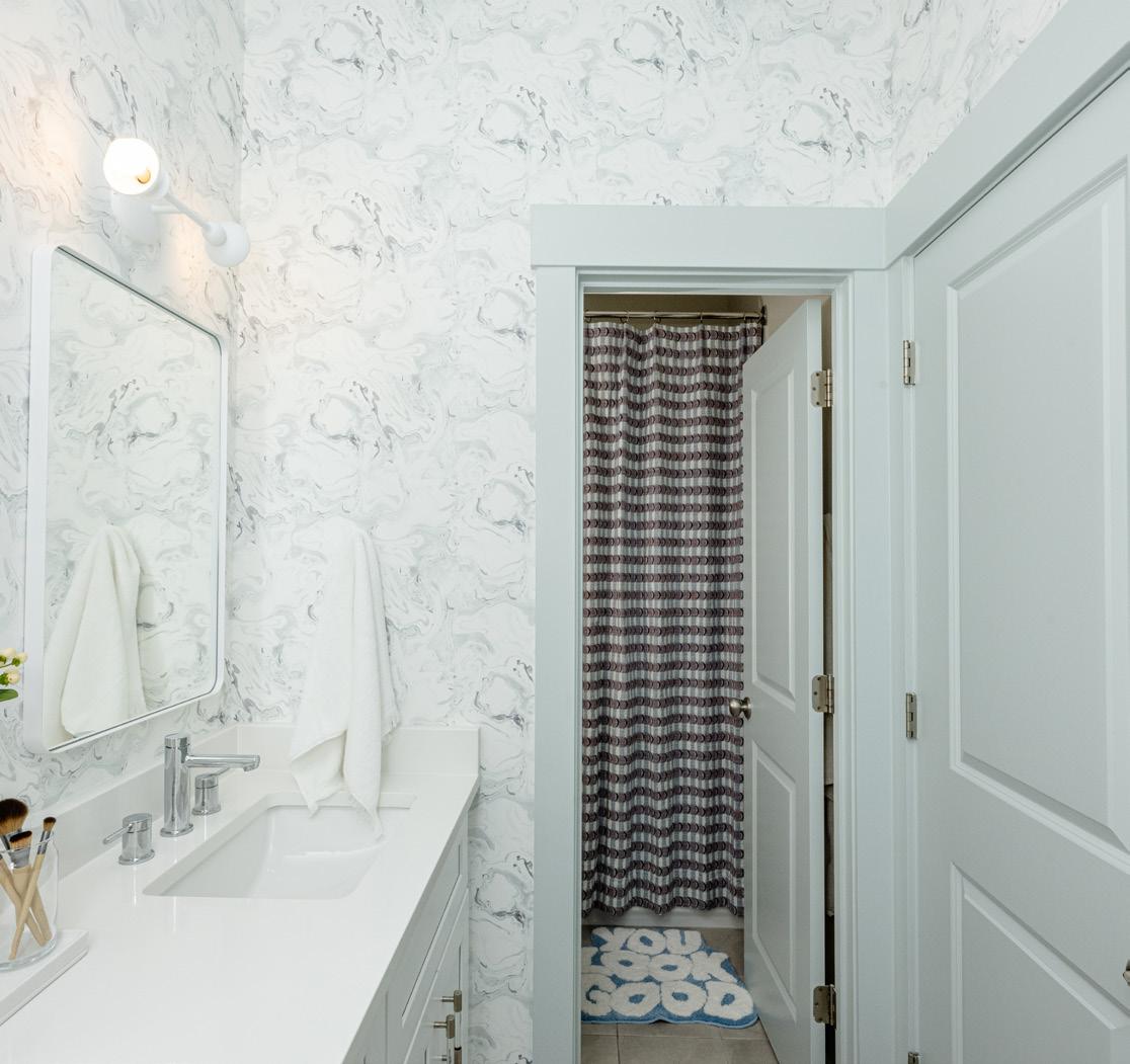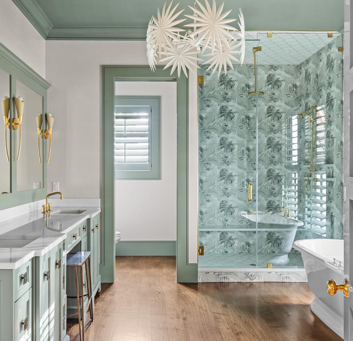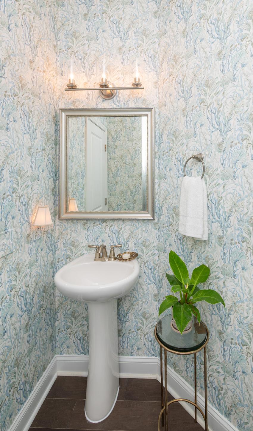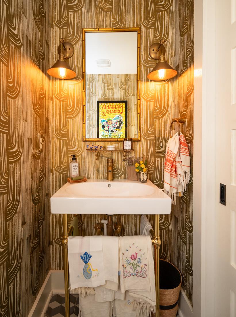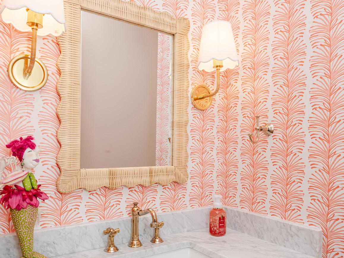 Designed by Randolph Cooper, this bathroom was transformed with a new desk and chair, light fixtures, and Thibaut wallpaper sourced from Southeastern Galleries.