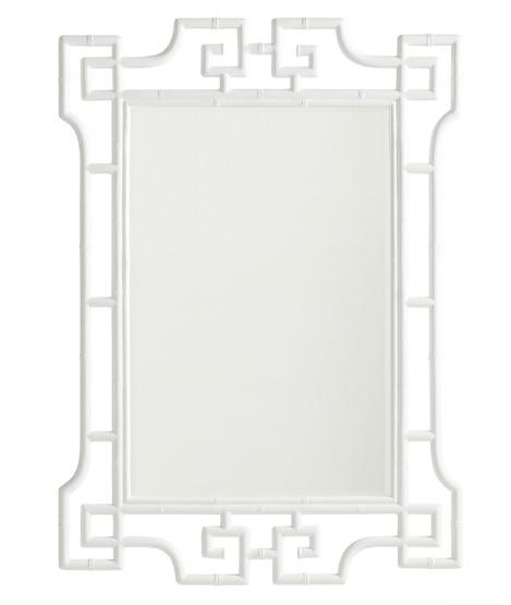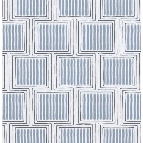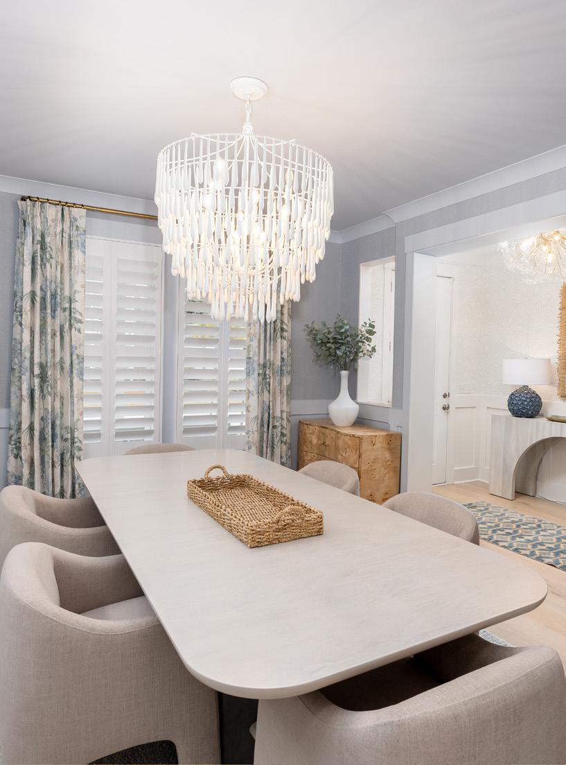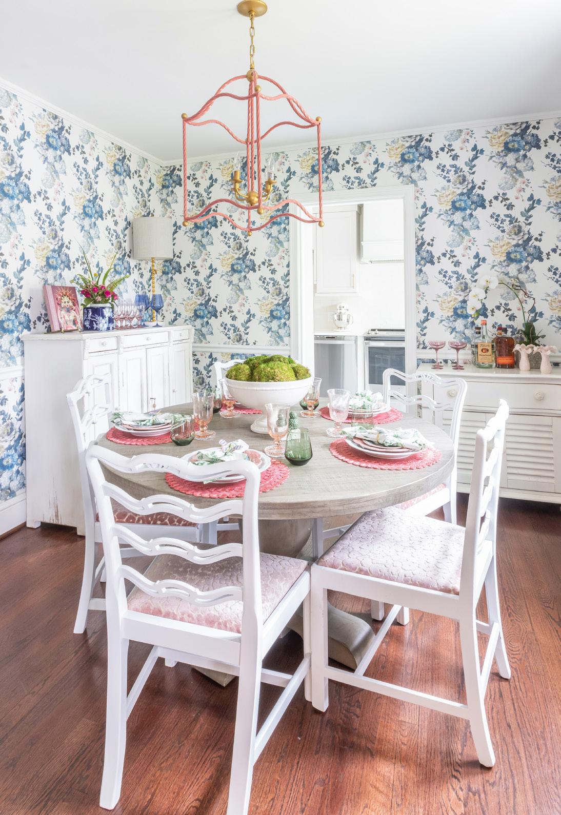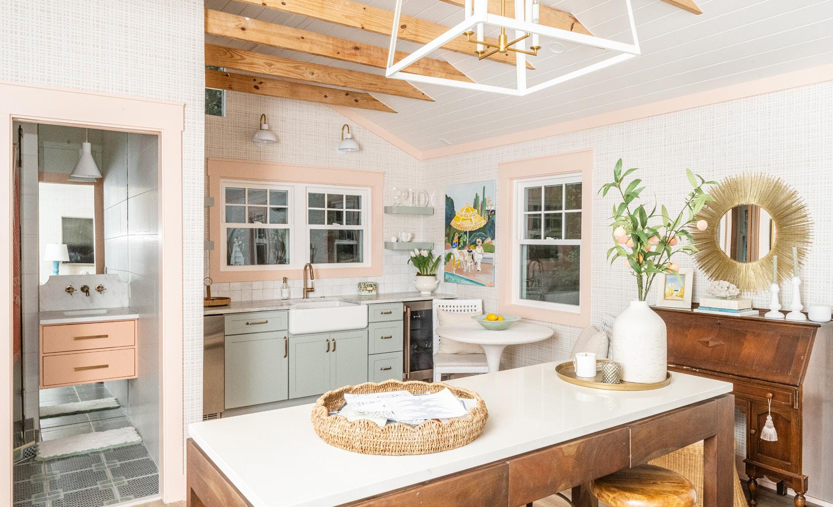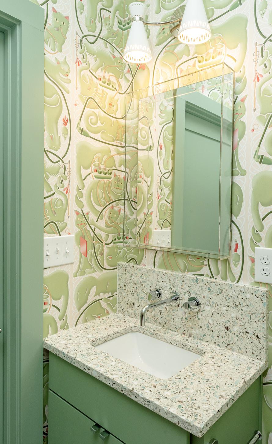 Designed by Randolph Cooper, this bathroom was transformed with a new desk and chair, light fixtures, and Thibaut wallpaper sourced from Southeastern Galleries.