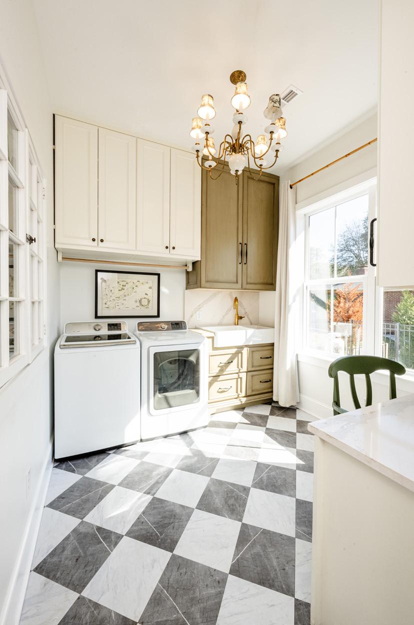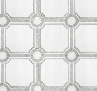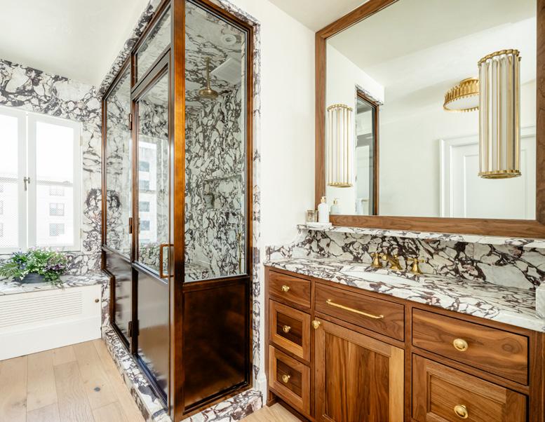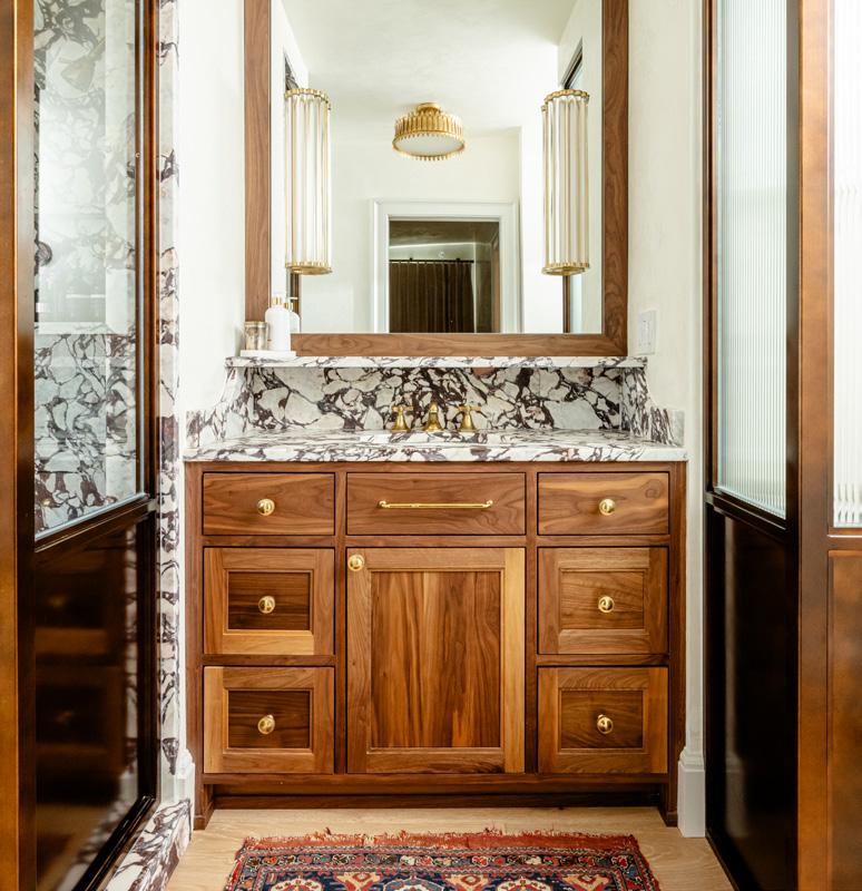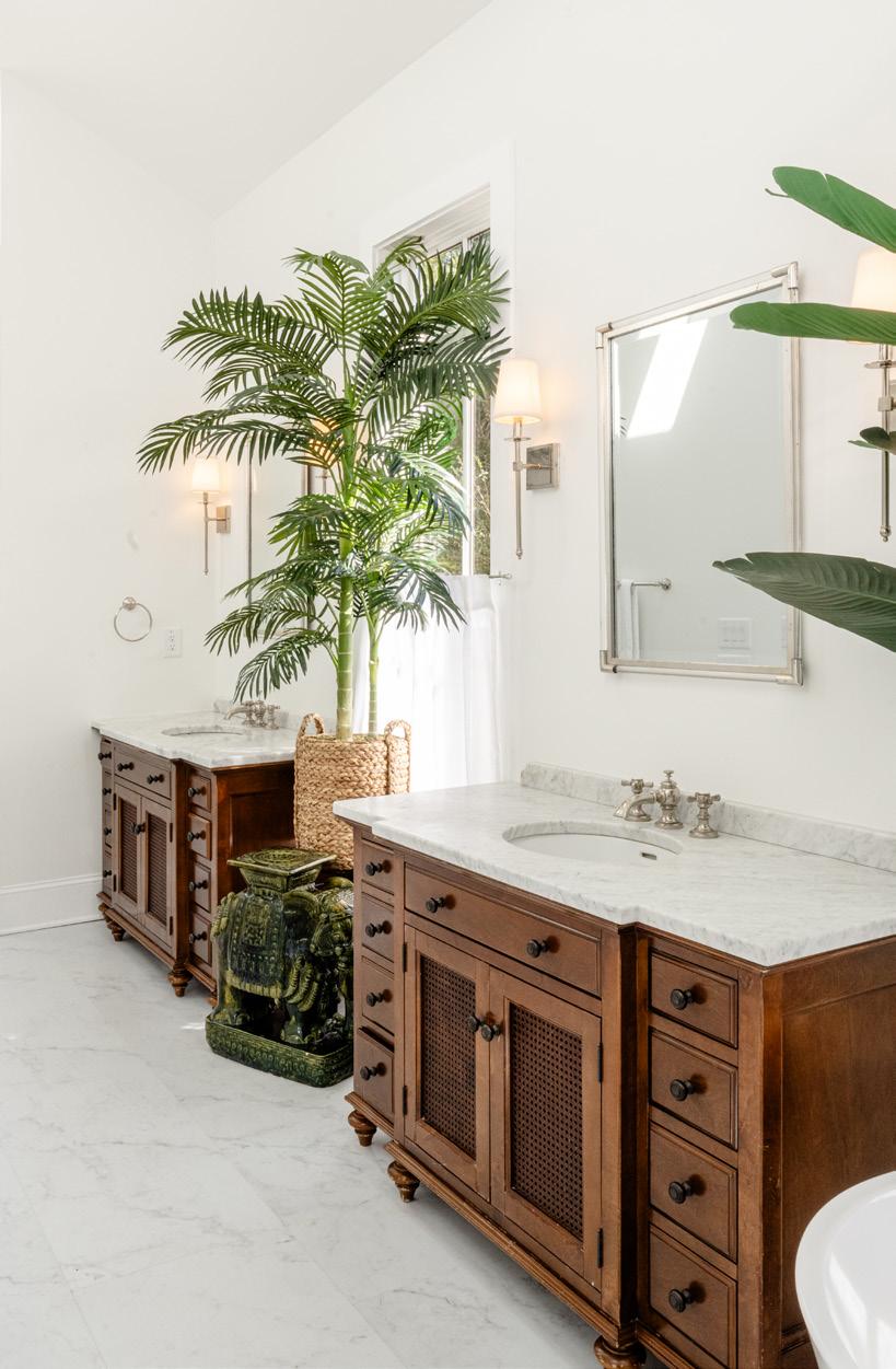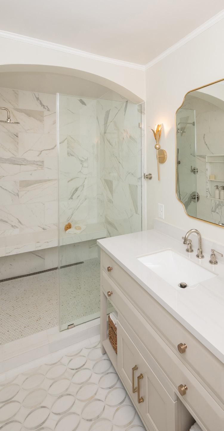 A complete bathroom overhaul characterized by stunning details include a custom inlaid tile floor and a pearlized backsplash. Dramatic and rare marble countertops complement the custom furniture-style dual vanity, while Currey & Co. light fixtures illuminate the finish of the Rohl plumbing fixtures. Adjacent storage towers create symmetry and balance while providing ample space for all the essentials.