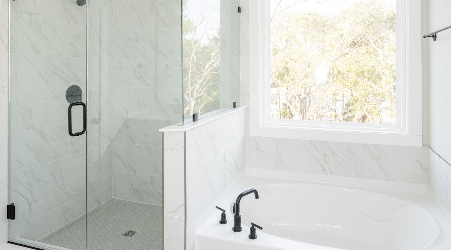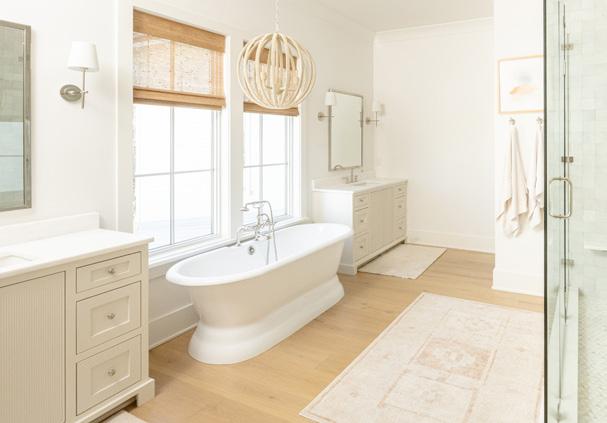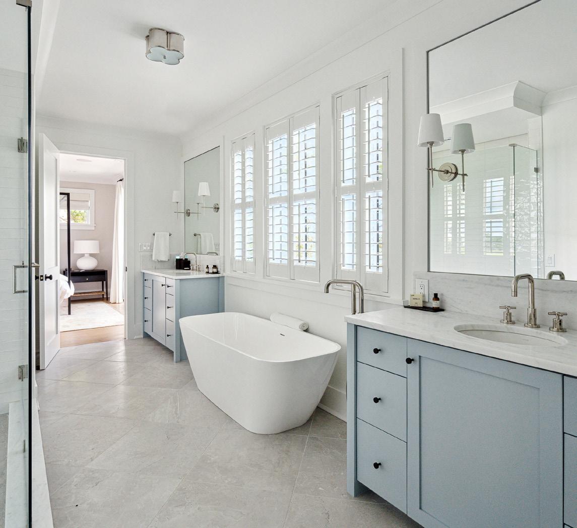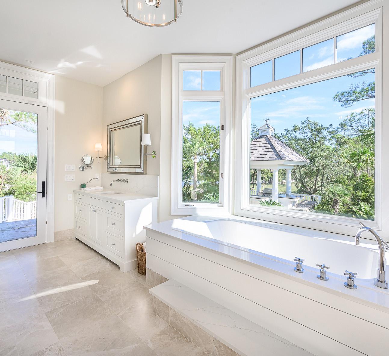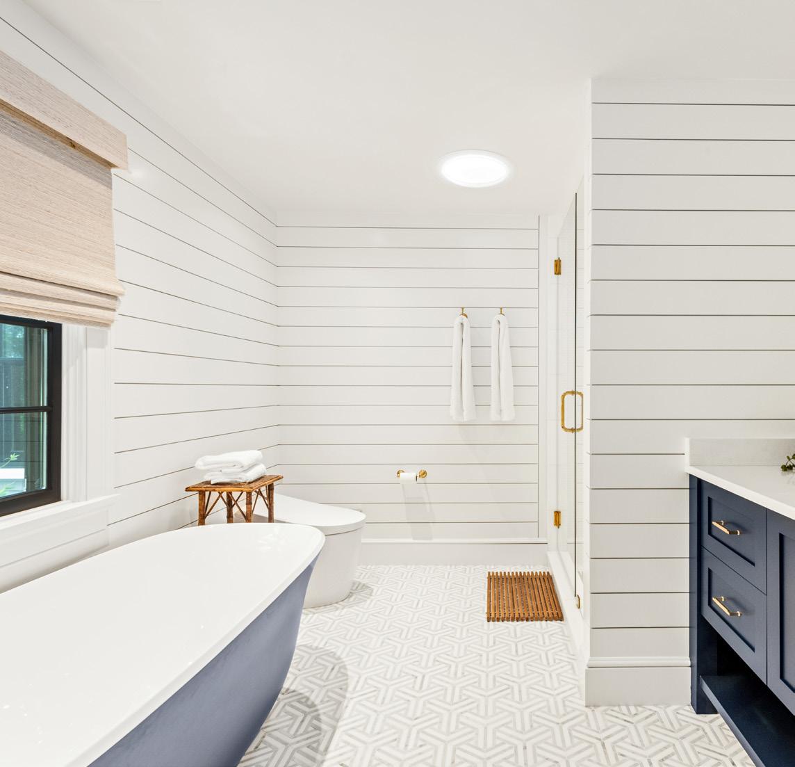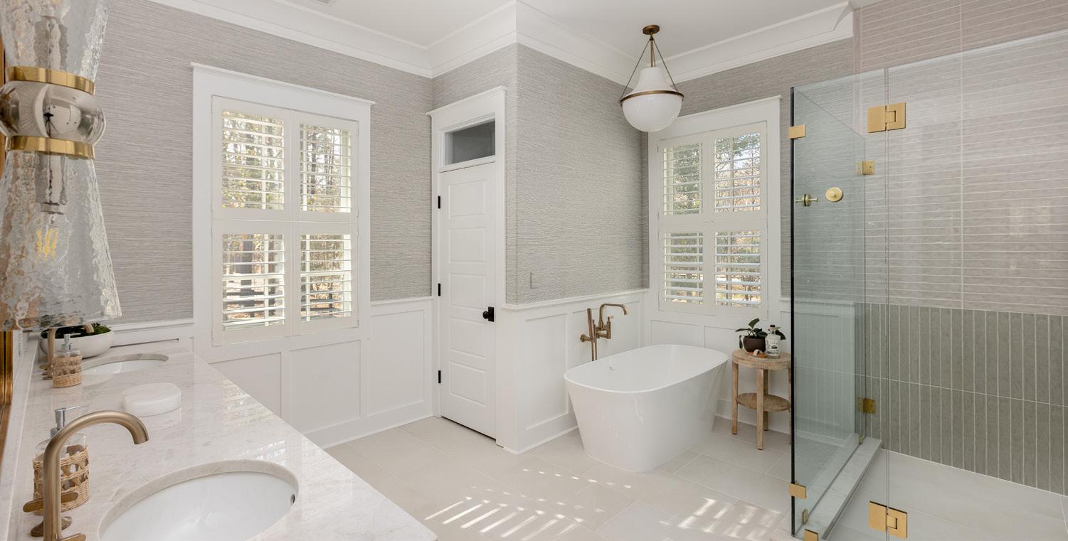 A luxurious custom bathroom featuring high-quality windows, moulding, and shiplap from Southern Lumber.