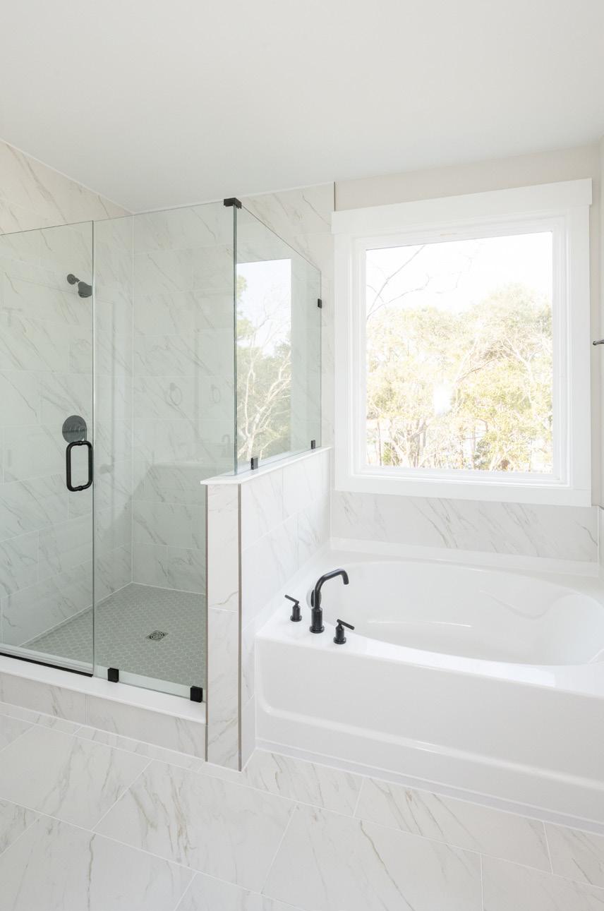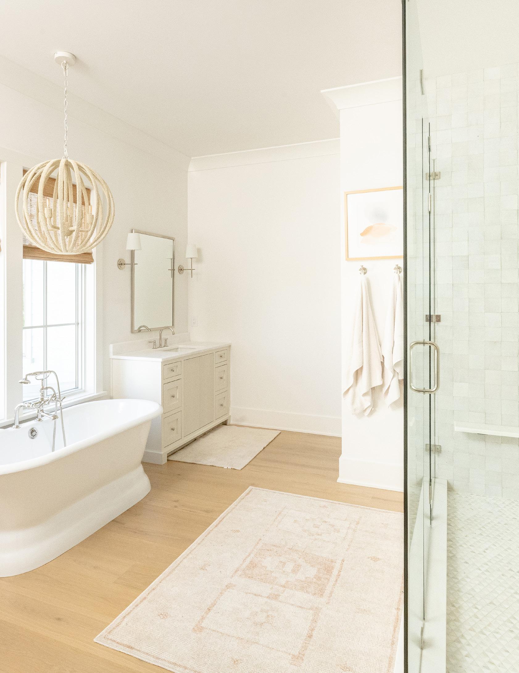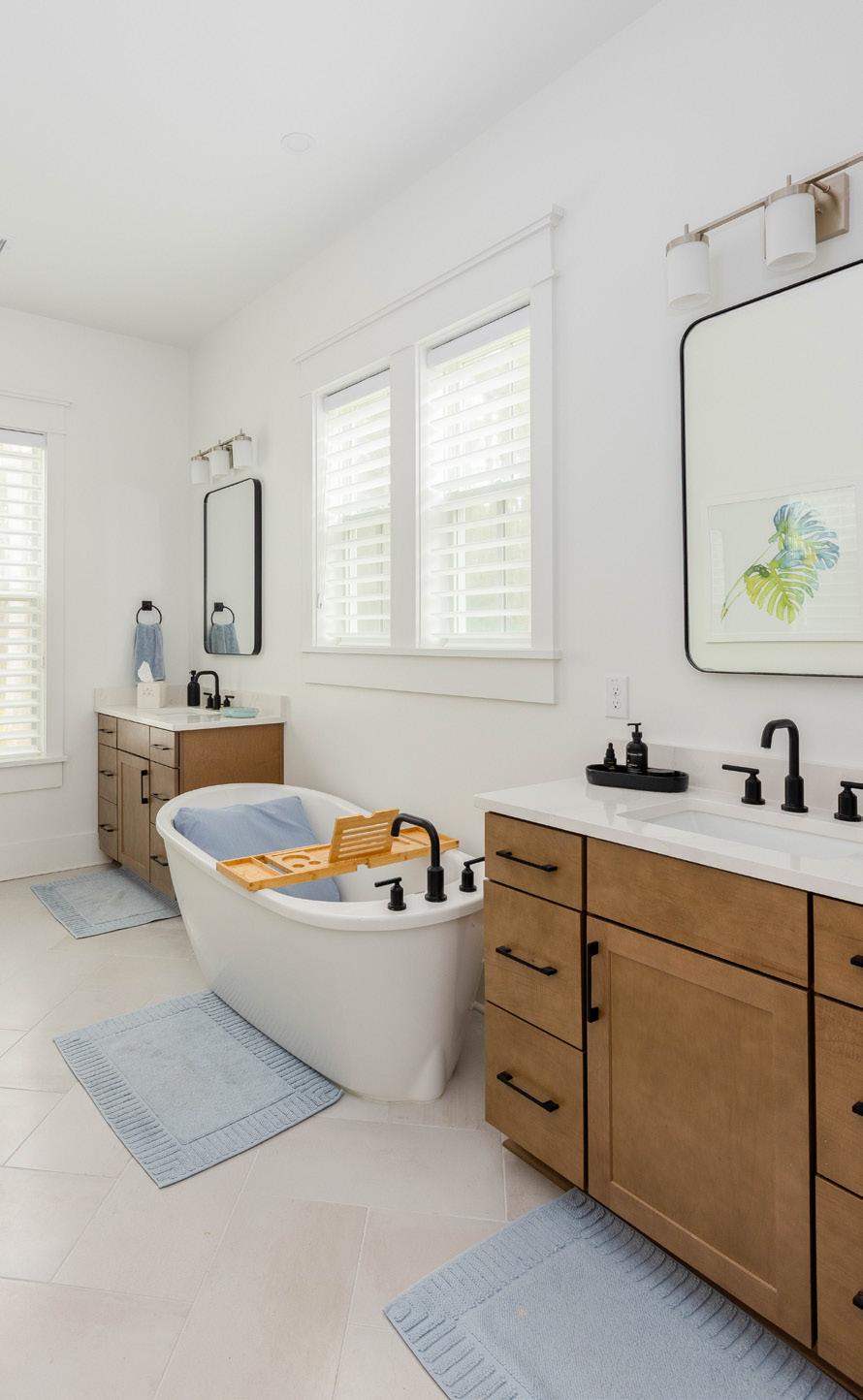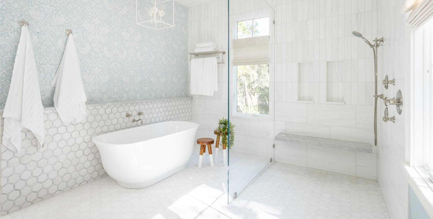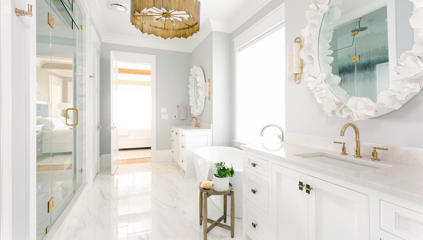A luxurious custom bathroom featuring high-quality windows, moulding, and shiplap from Southern Lumber.