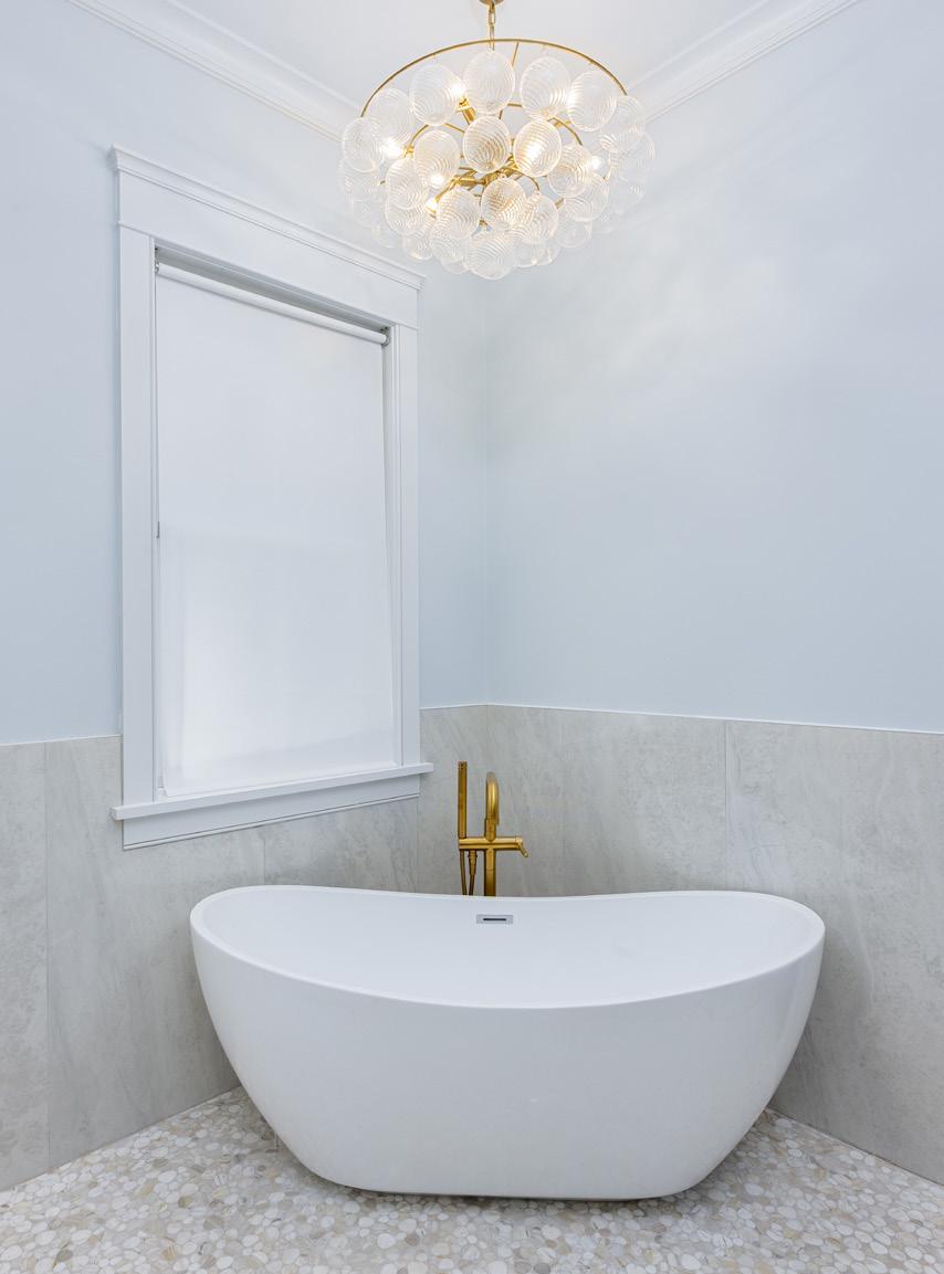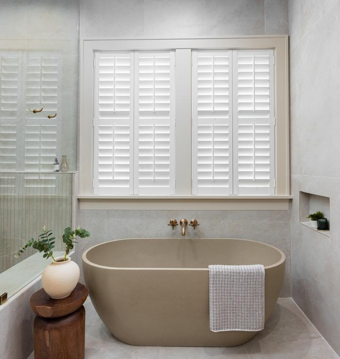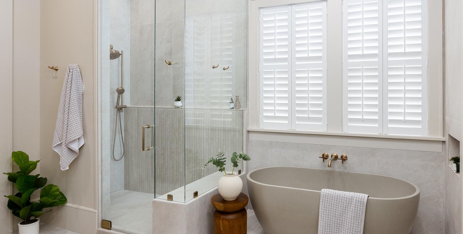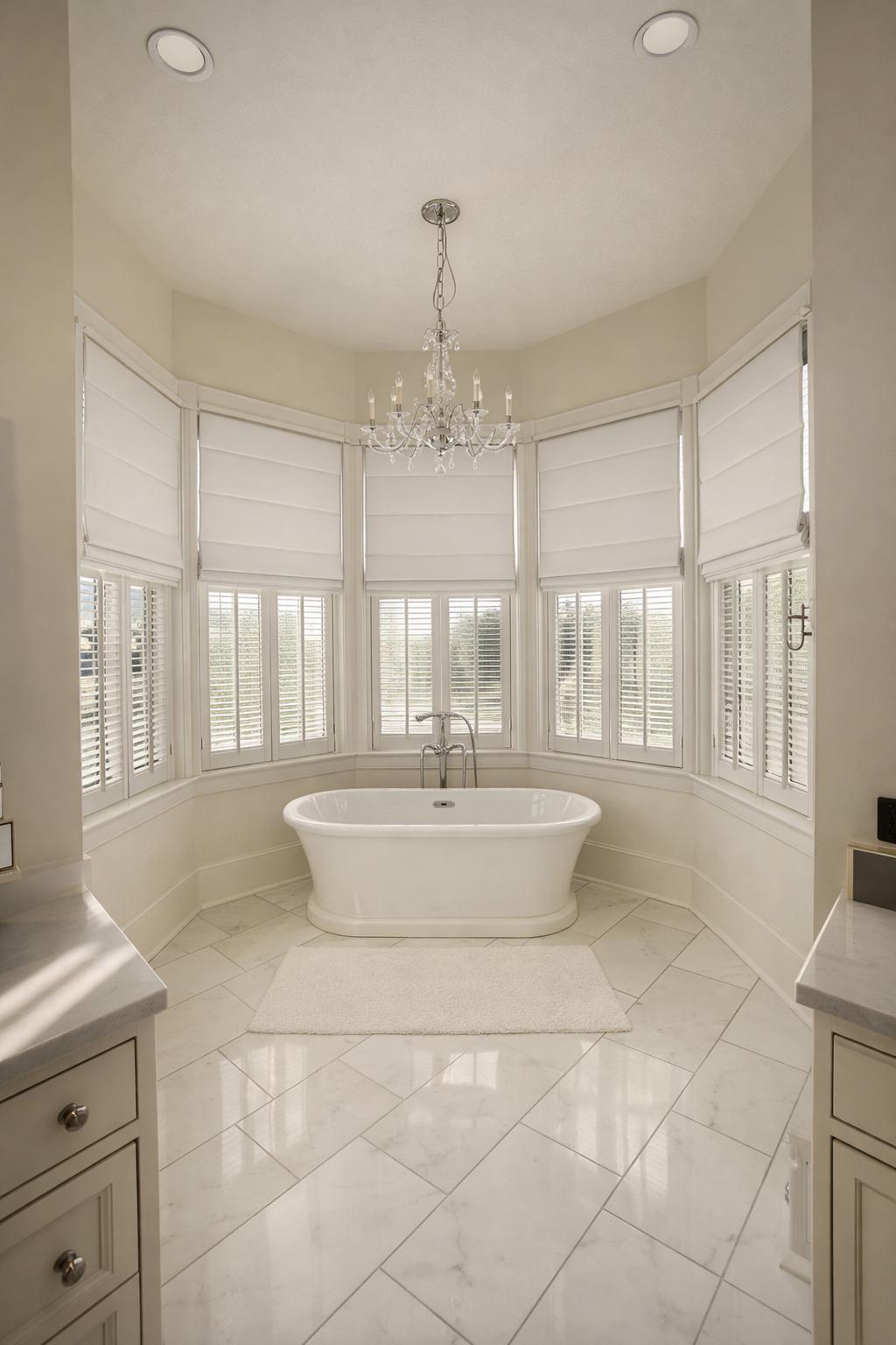 Motorized, custom-fit shades are perfect for windows near soaking tubs, combining effortless control with privacy and softly filtered natural light.