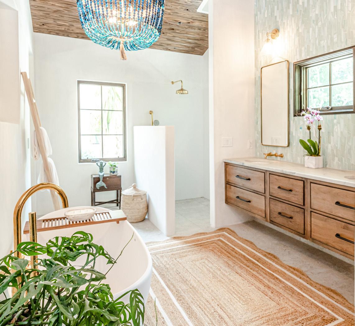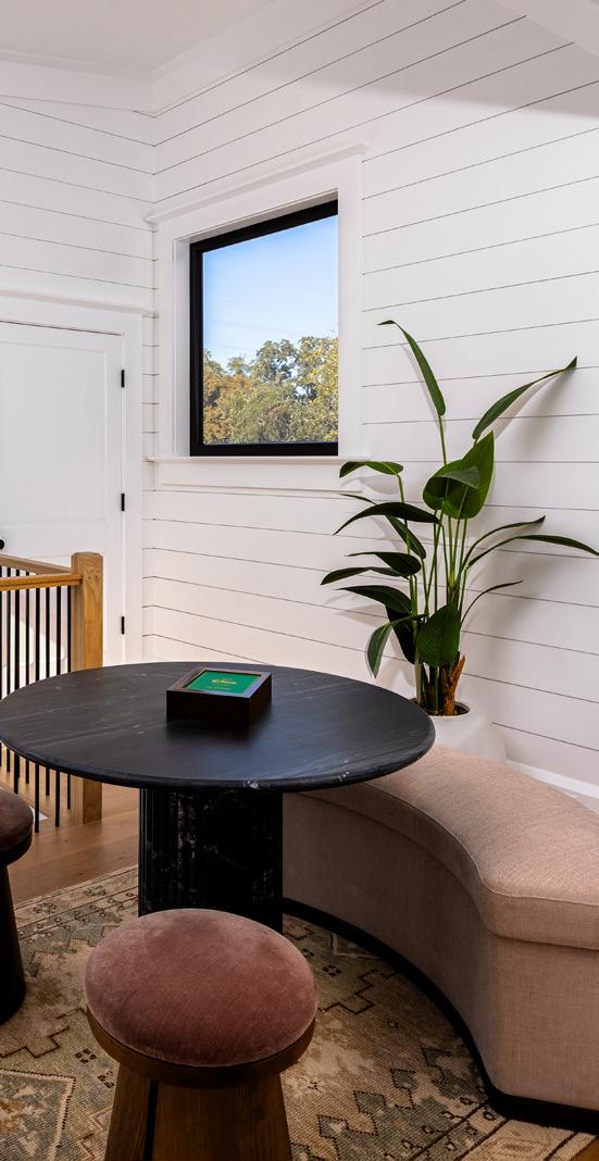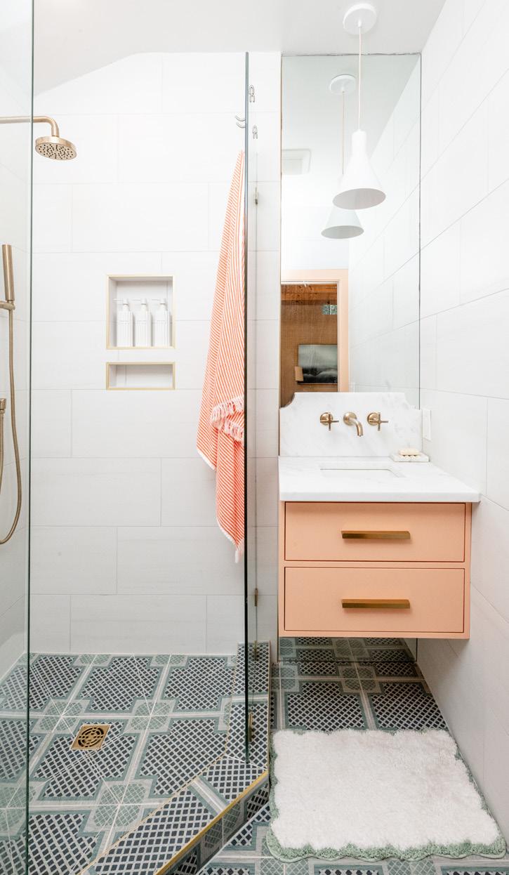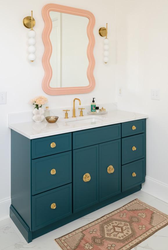 Bold color, boho-chic layers, and intentional patterning set a playful tone, giving the full bathroom permission to have fun while serving its function. The result is a selfcontained space that feels fresh, expressive, and effortlessly cool. This kind of spot is designed to be lived in and enjoyed.