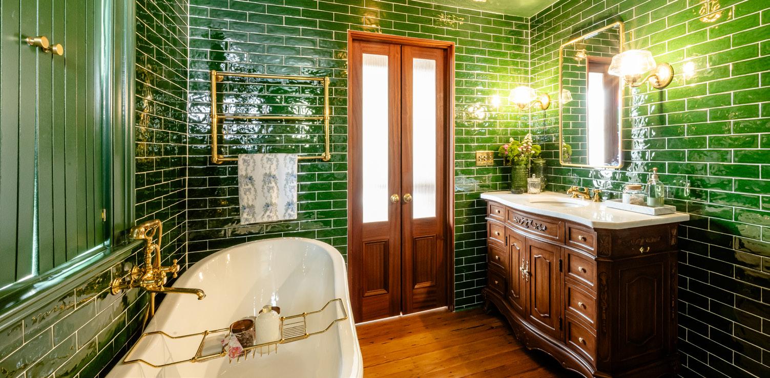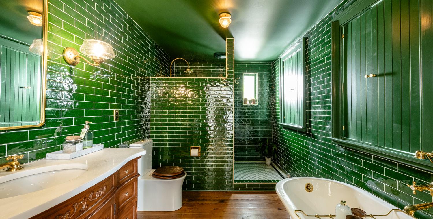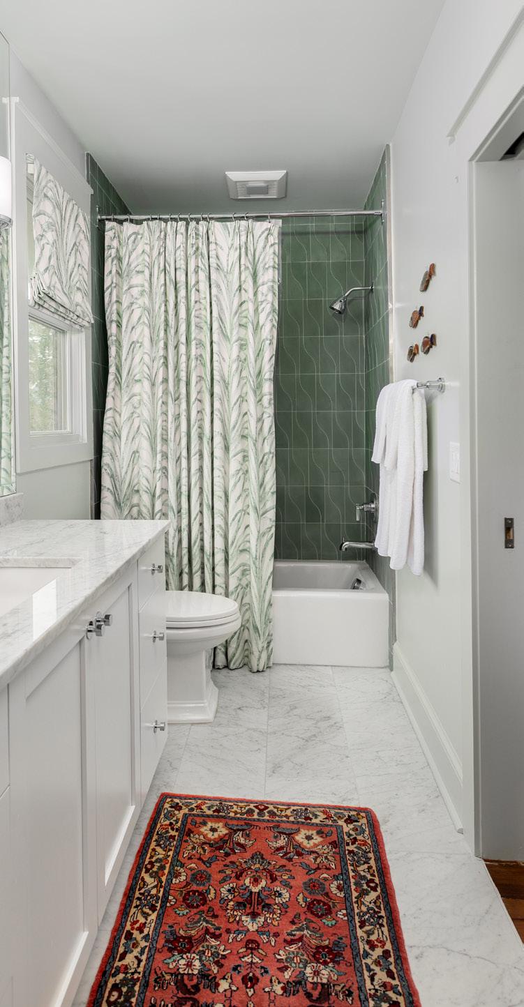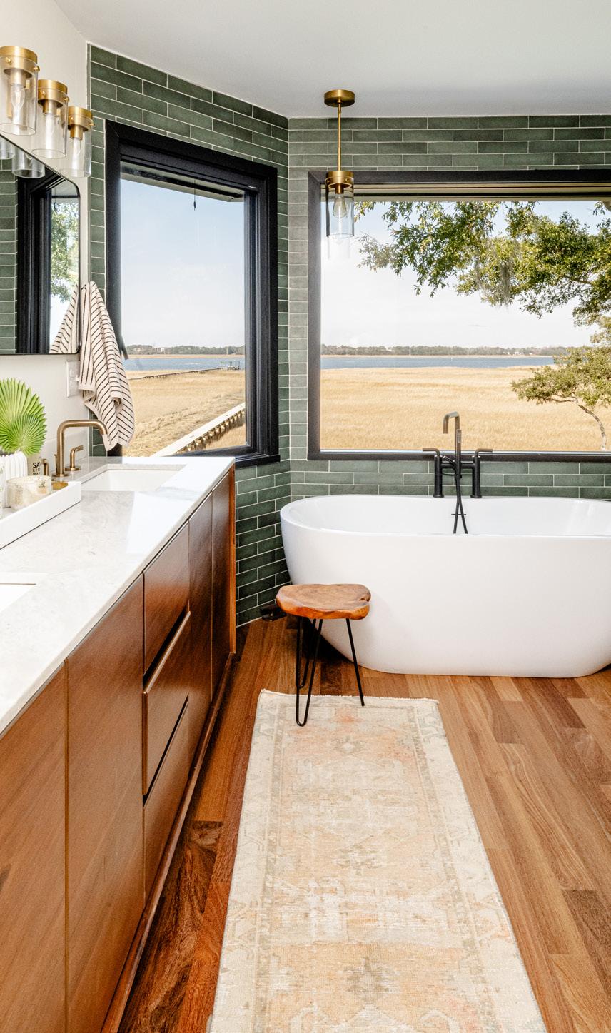 A retro-modern bath with warmth and depth. Green subway tile wraps the walls and carries up the window line, creating a striking backdrop for the freestanding tub set against marsh views. Natural wood grounds the space, while soft tones are brought out by the Zuma Imports vintage rug.