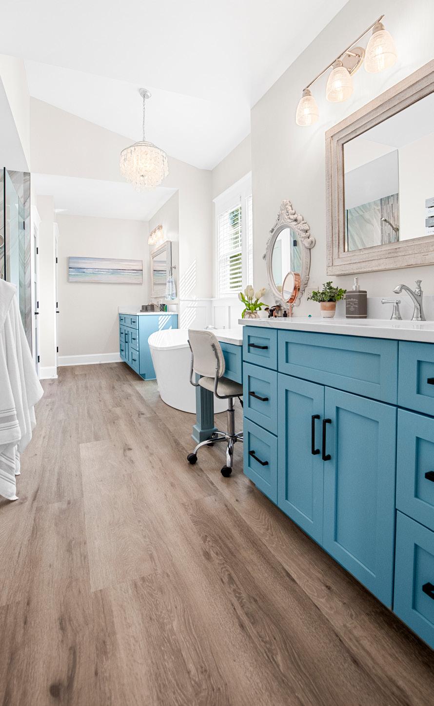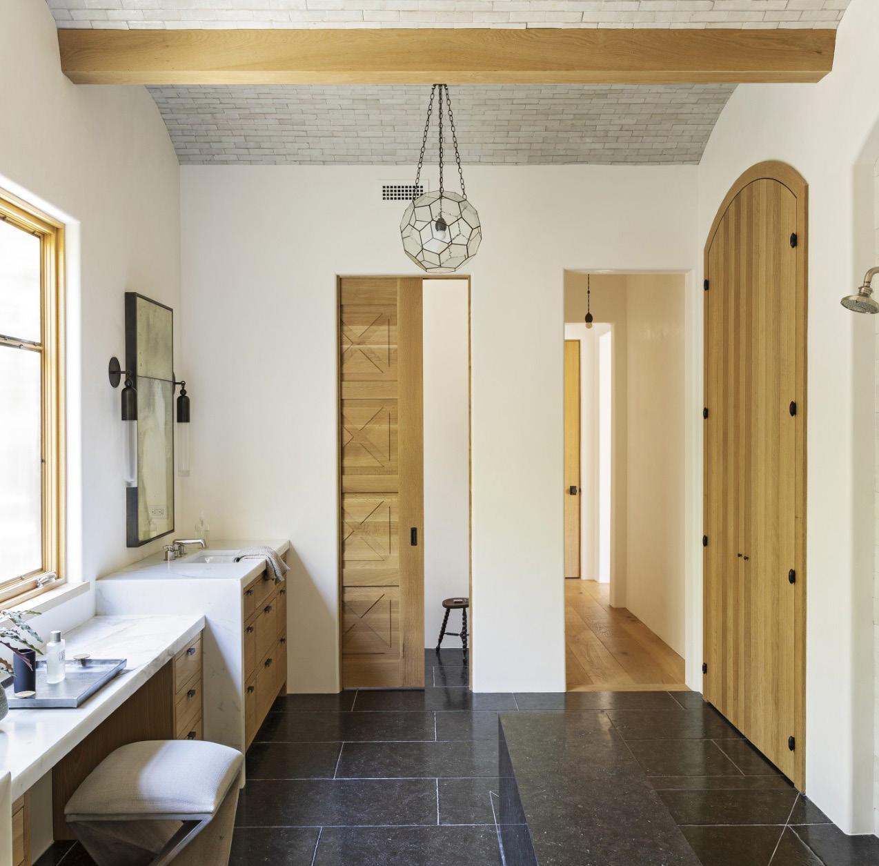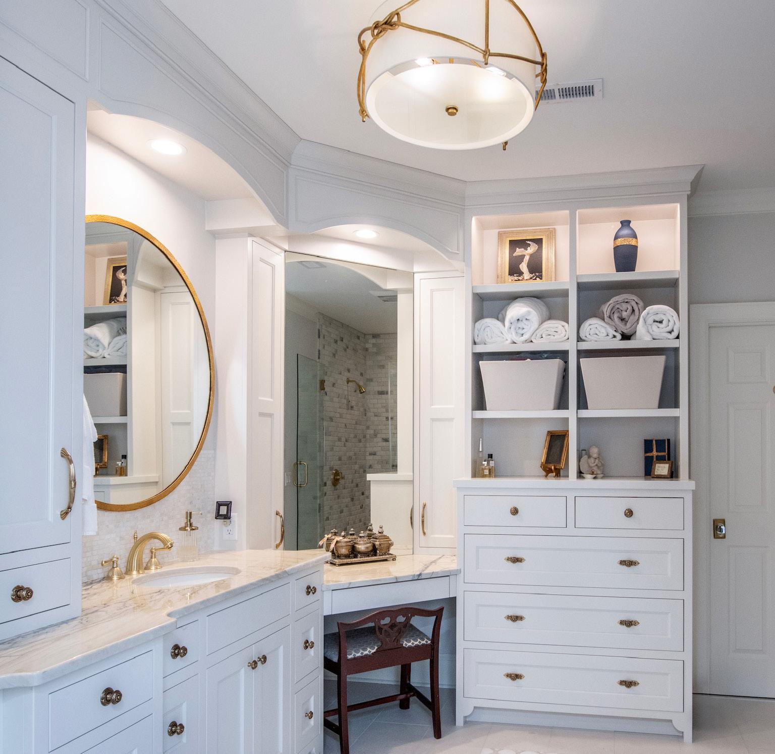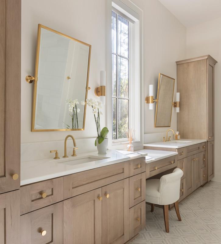 The design of this primary bathroom considers shape and scale, emphasizing natural light with a seated vanity area built between custom cabinetry. Warm tones feel cozy, comfortable, and created for two.