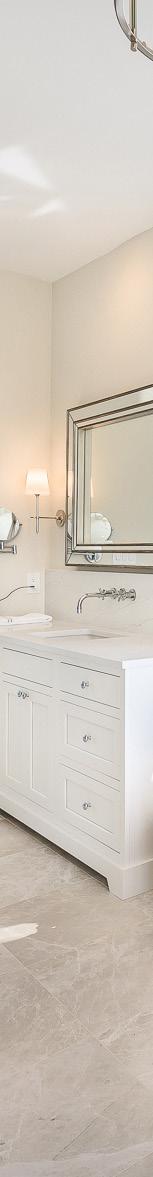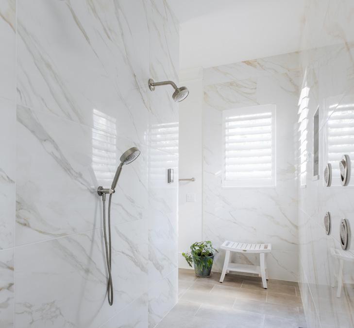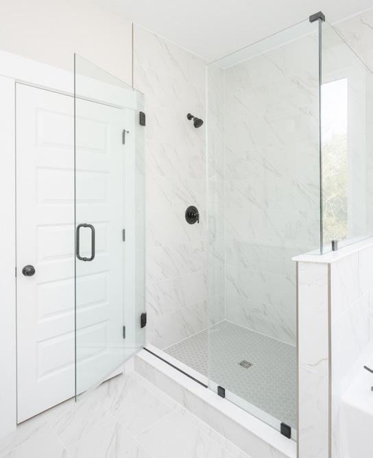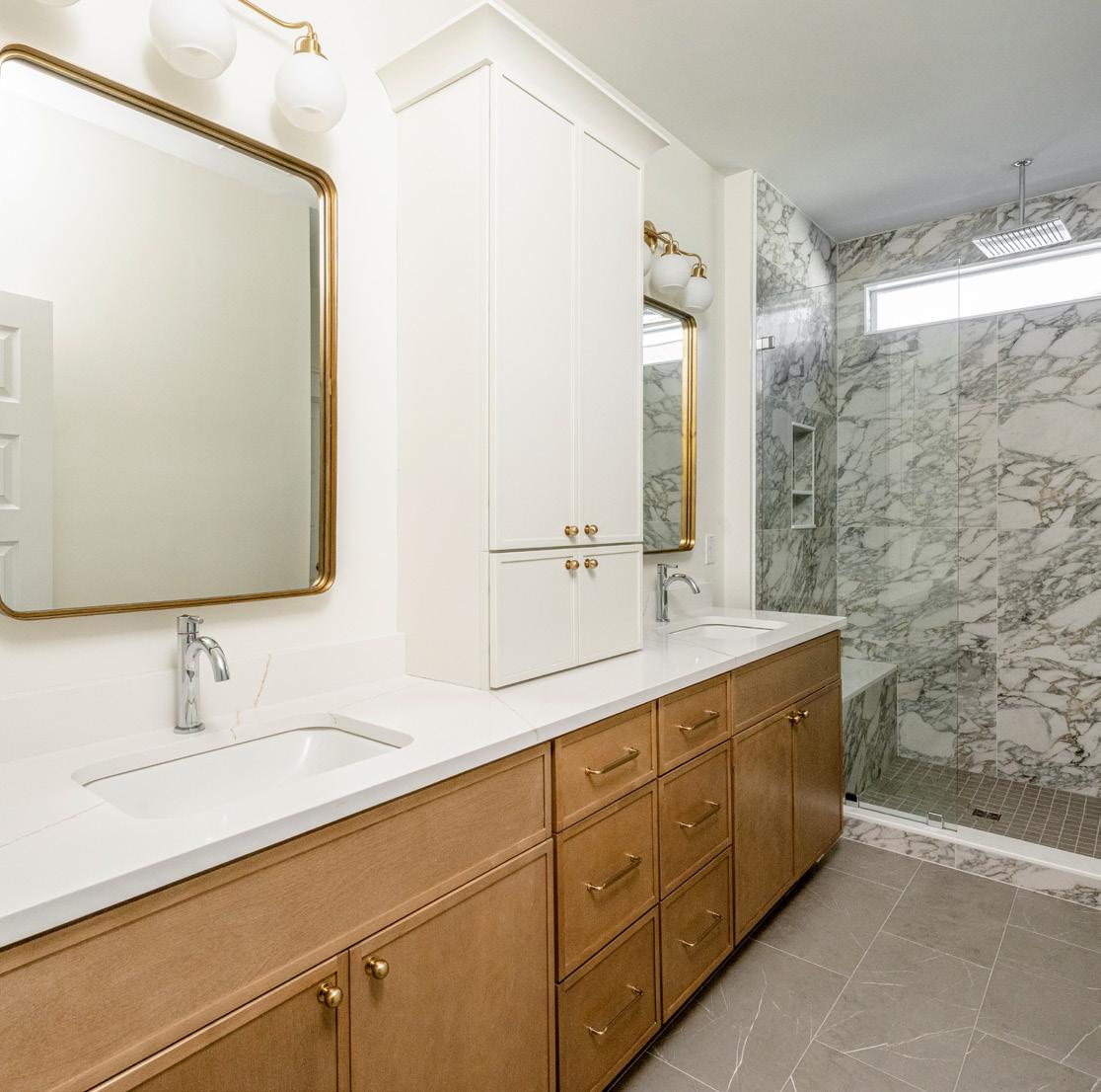 Refined materials and expert craftsmanship define this custombuilt bathroom where porcelain tile and honed marble countertops offer a balanced and timeless look. Separate vanities and a frameless shower enhance comfort and flow.