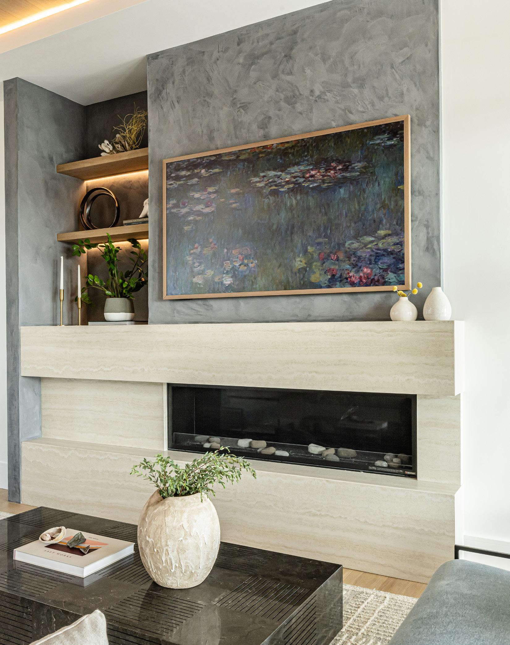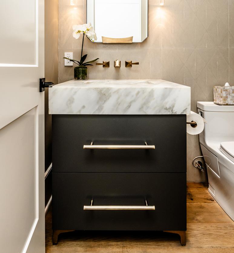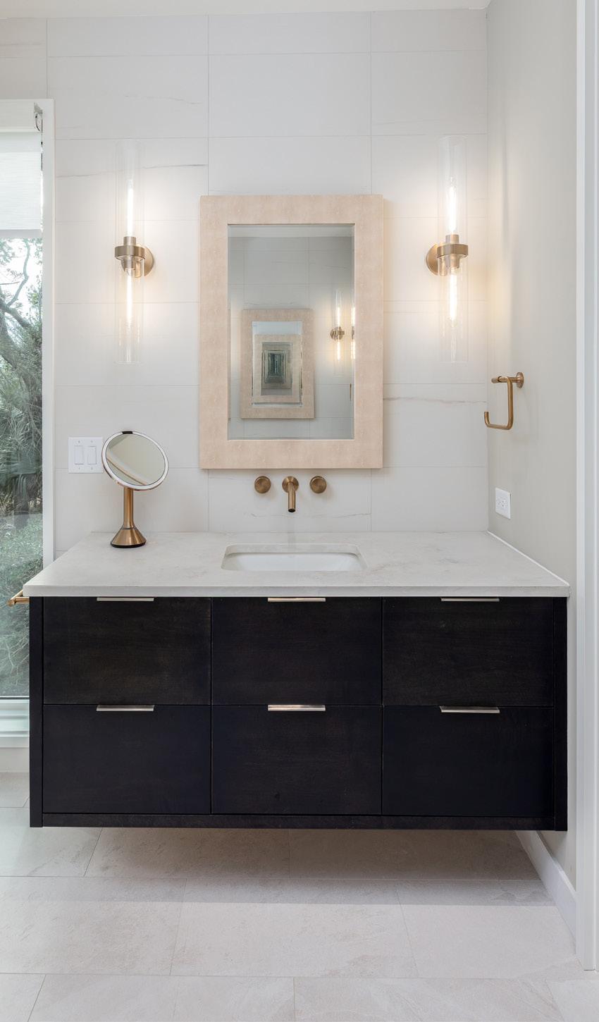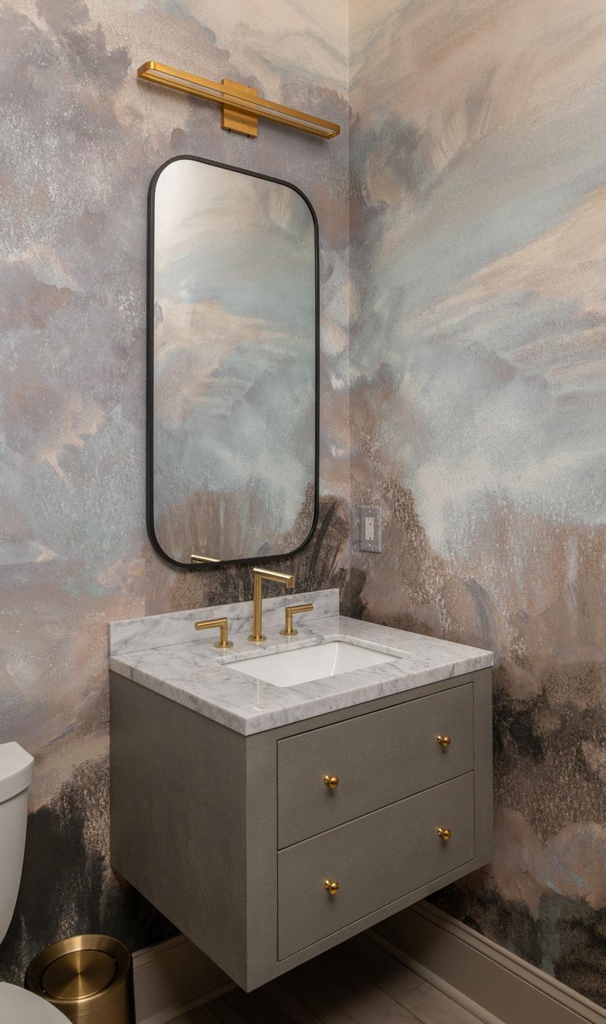 A professionally designed bathroom is as luxurious as it is functional. With a unique shagreen floating cabinet and full-scale mural, the space was completely transformed.