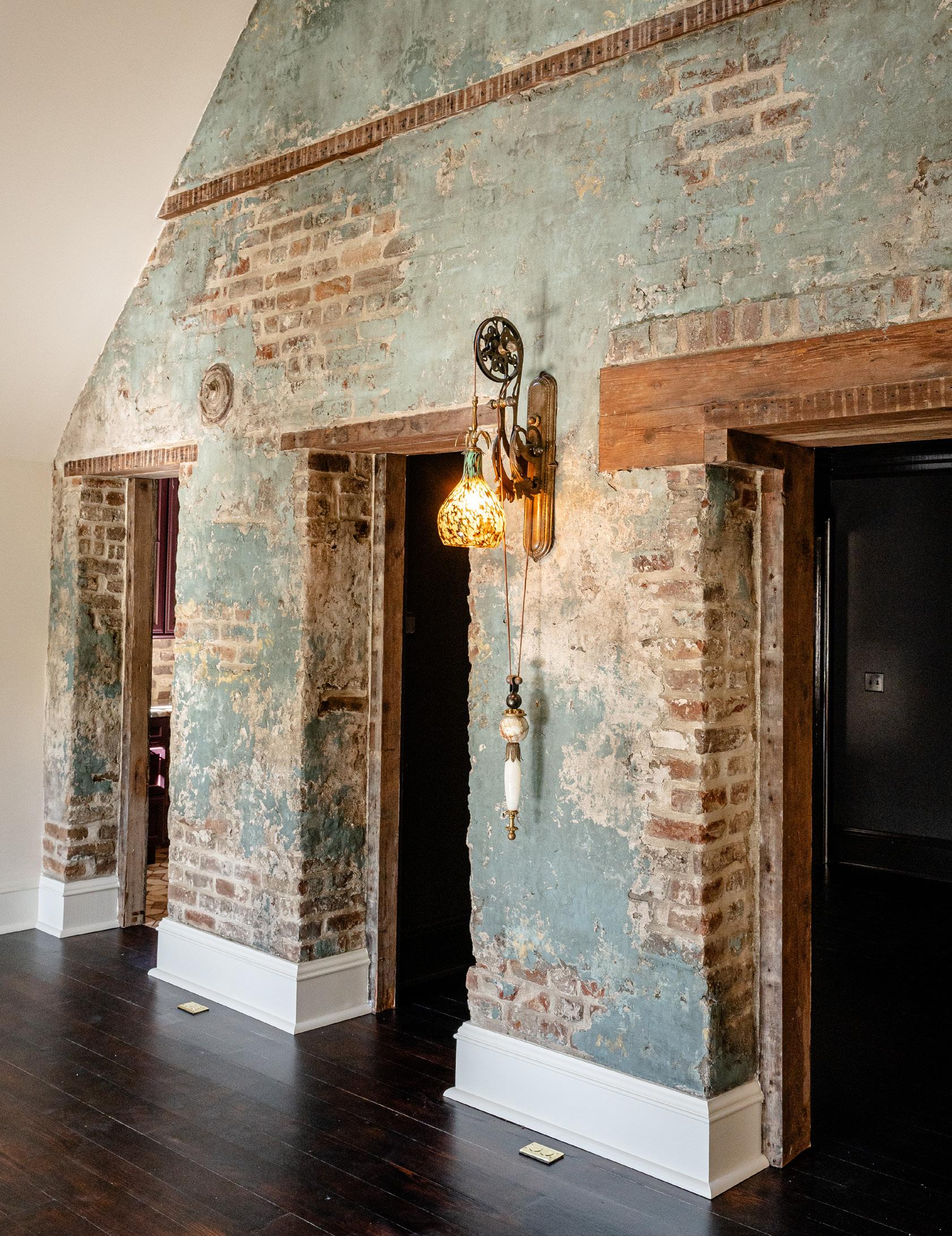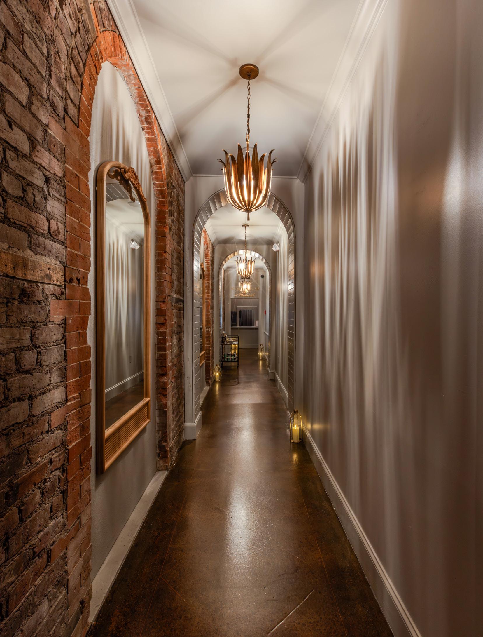 (above right) Ambient lighting, relaxing aromas, and soft sounds abound with relaxation just around the corner. The spa’s signature atmosphere translates from its first two Charleston locations: Mount Pleasant and West Edge. (opposite) The intimate entrance corridor to Woodhouse Spa at The Wentworth Mansion envelops guests at the first step.
