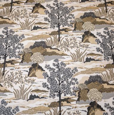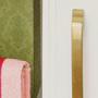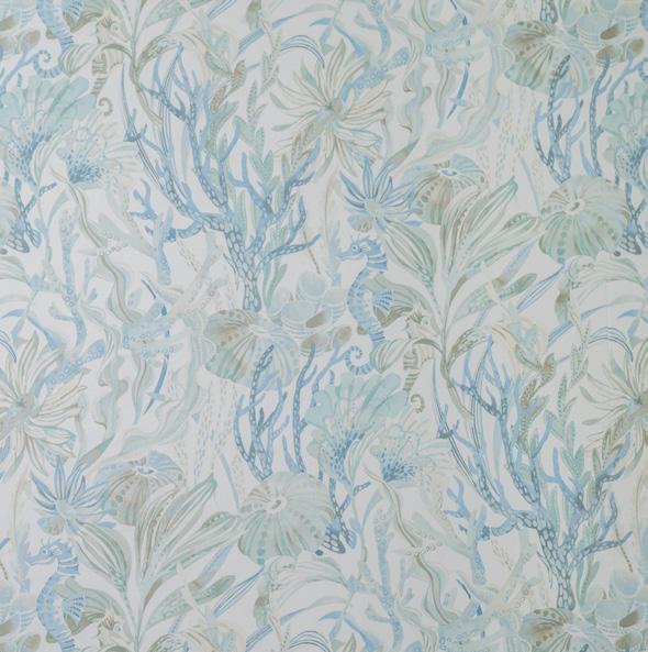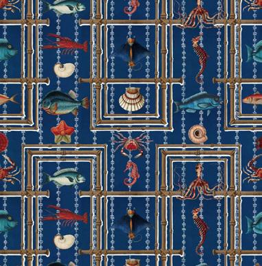A whimsical, under-the-sea “kelp garden” wallcovering comes to life with antique brass accents and subtle lighting, letting the pattern take center stage in this bathroom with pieces from Seawah Furniture | Design.