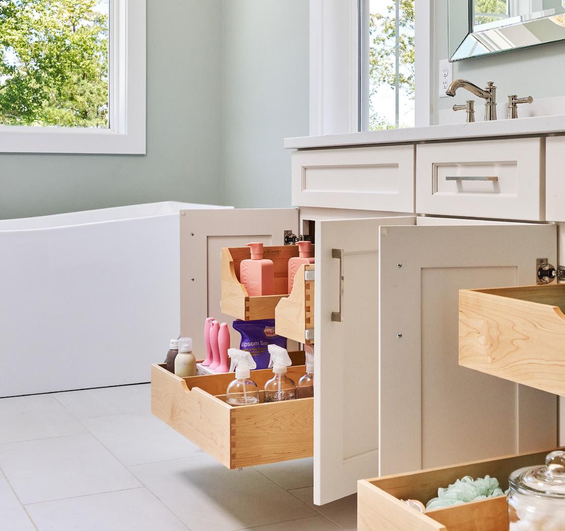 Custom-built around the bathroom's plumbing fixtures, this new storage system gives the homeowners easy access to their stored items while keeping the countertops free from clutter.