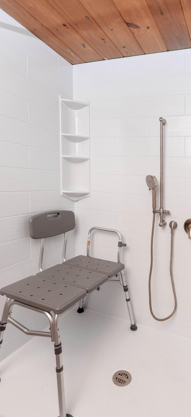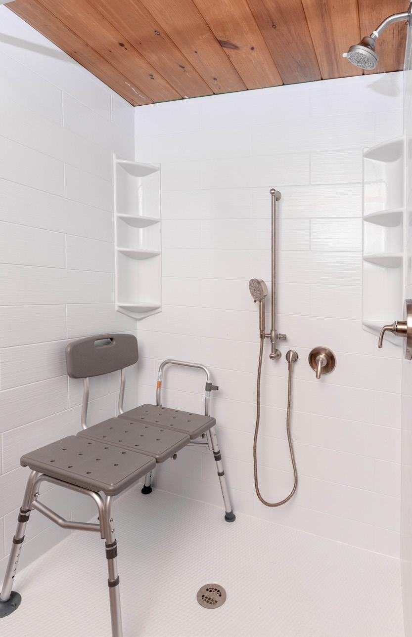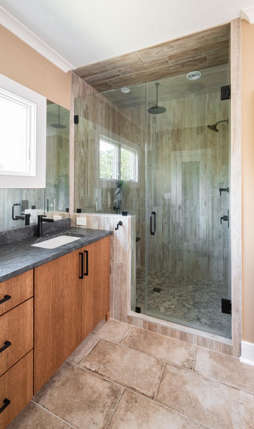 Salt Stone Ash tile creates a wet-room feel in this custom bathroom built by Priester's Custom Contracting with house plans by Crosby Creations Home Designs and interiors designed by Marie Lindenmeyer.