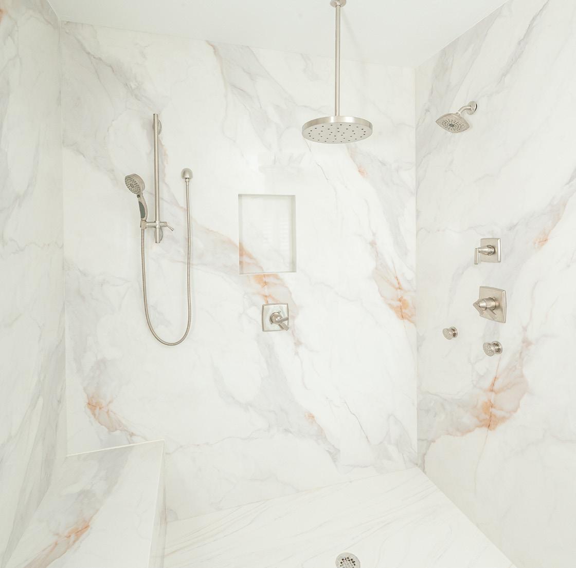 Calacatta Greige Base and Sonoro Walls Fabricated and Installed by Palmetto Surfacing, palmettosurfacing.com