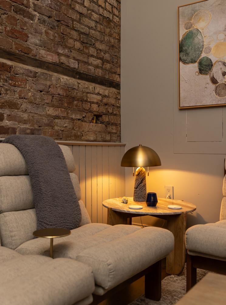 The result is a space that feels warm, layered, and thoughtfully composed. Plush gray and brown upholstery anchors the interiors, paired with soft, marshmallow-soft blankets, dim ambient lighting, and gentle aromatics that linger without overwhelming. The palette stays true to Woodhouse’s signature warm neutrals, but the effect here is more residential than resort-like. Here, it’s less about spectacle, more about comfort.