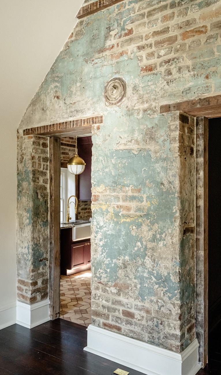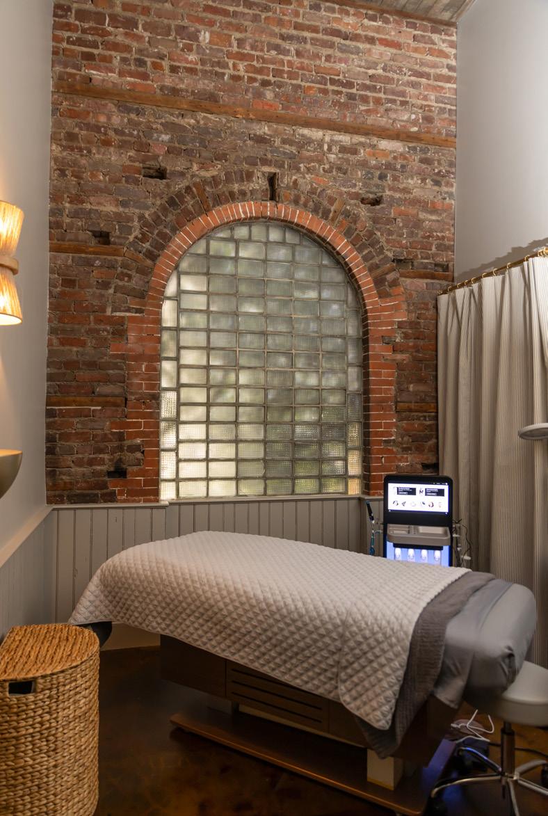 Every design decision was shaped by both the building’s limitations and its history. The carriage house dates back to the late 1800s, and many of its original architectural elements remain intact. Exposed brick walls, wood beams, and arched details give the spa an unmistakable Charleston character, while textured glass windows add visual interest and softly diffuse natural light. Rather than covering or disguising these features, Kimmy and her team, including, Designer and former Charleston Home + Design Magazine cover star JuJu Taylor, leaned into them, allowing the building’s bones to guide the design. Designing a spa within such a compact footprint