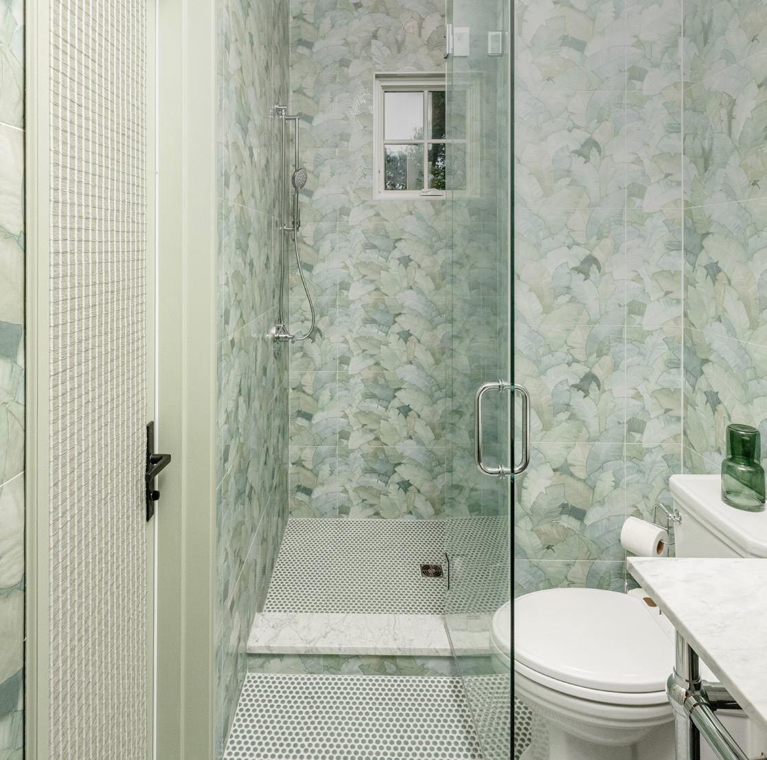 A glass shower enclosure frames the bathroom corner like a sculptural focal point, lending openness while defining the shower with clean sight lines.
