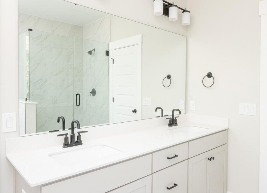 Built by Messina Homes with cabinets by Artistic Cabinetry & Millworks, Thassos White Quartz countertops on 6" miter make an elegant impact in this custom bathroom.