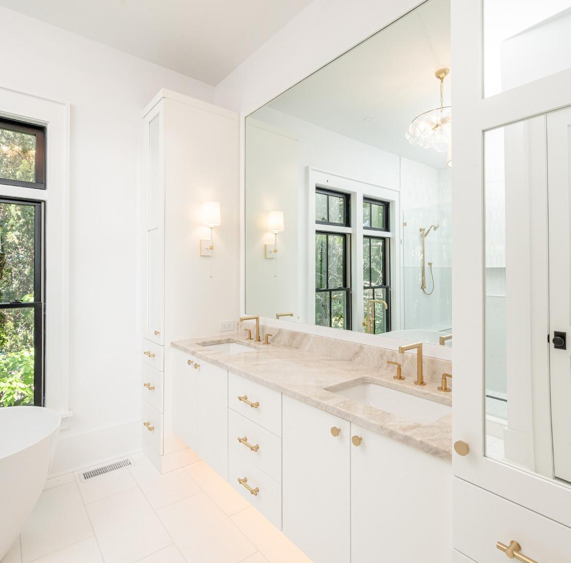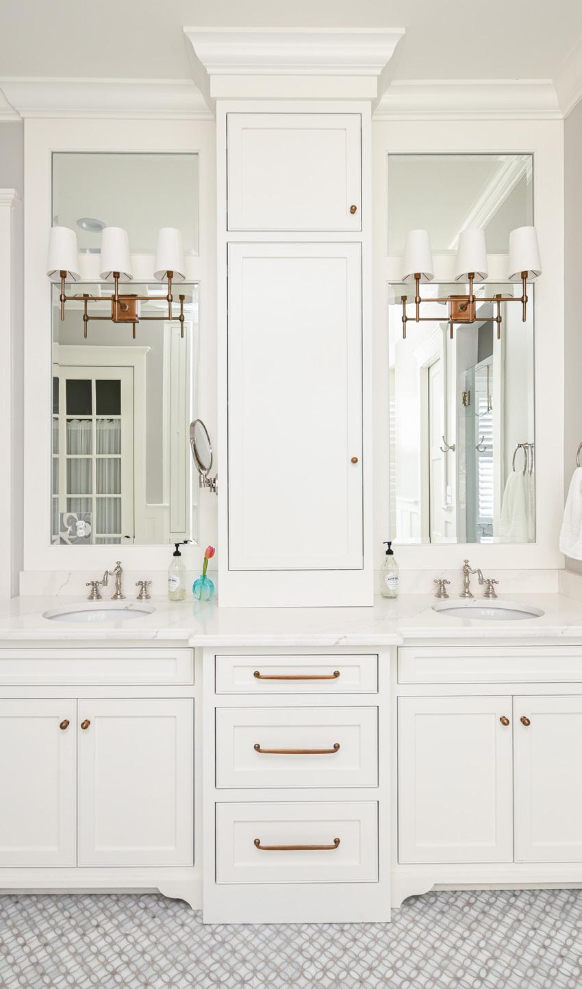 The double vanity's inset construction feels like furniture, painted simply white with honed Lumen countertops. Built-in mirrors and custom storage towers with mirrored doors are perfect for morning and night routines.