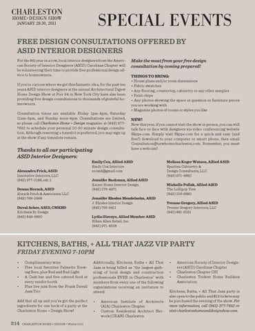 FREE DESIGN CONSULTATIONS OFFERED BY ASID INTERIOR DESIGNERS For the 8th year in a row, local interior designers from the American Society of Interior Designers (ASID) Carolinas Chapter will be volunteering their time to provide free professional design advice to homeowners. If you're curious where we got this fantastic idea, for the past ten years ASID interior designers at the annual Architectural Digest Home Design Show at Pier 94 in New York City have also been providing free design consultations to thousands of grateful homeowners. Consultation times are available Friday 1pm-4pm, Saturday 11am-5pm, and Sunday noon-4pm. Consultations are limited, so please call Charleston Home + Design magazine at (843) 5777652 to schedule your personal 20-30 minute design consultation. Although reserving a timeslot is preferred, you may sign up at the show if any timeslots remain.