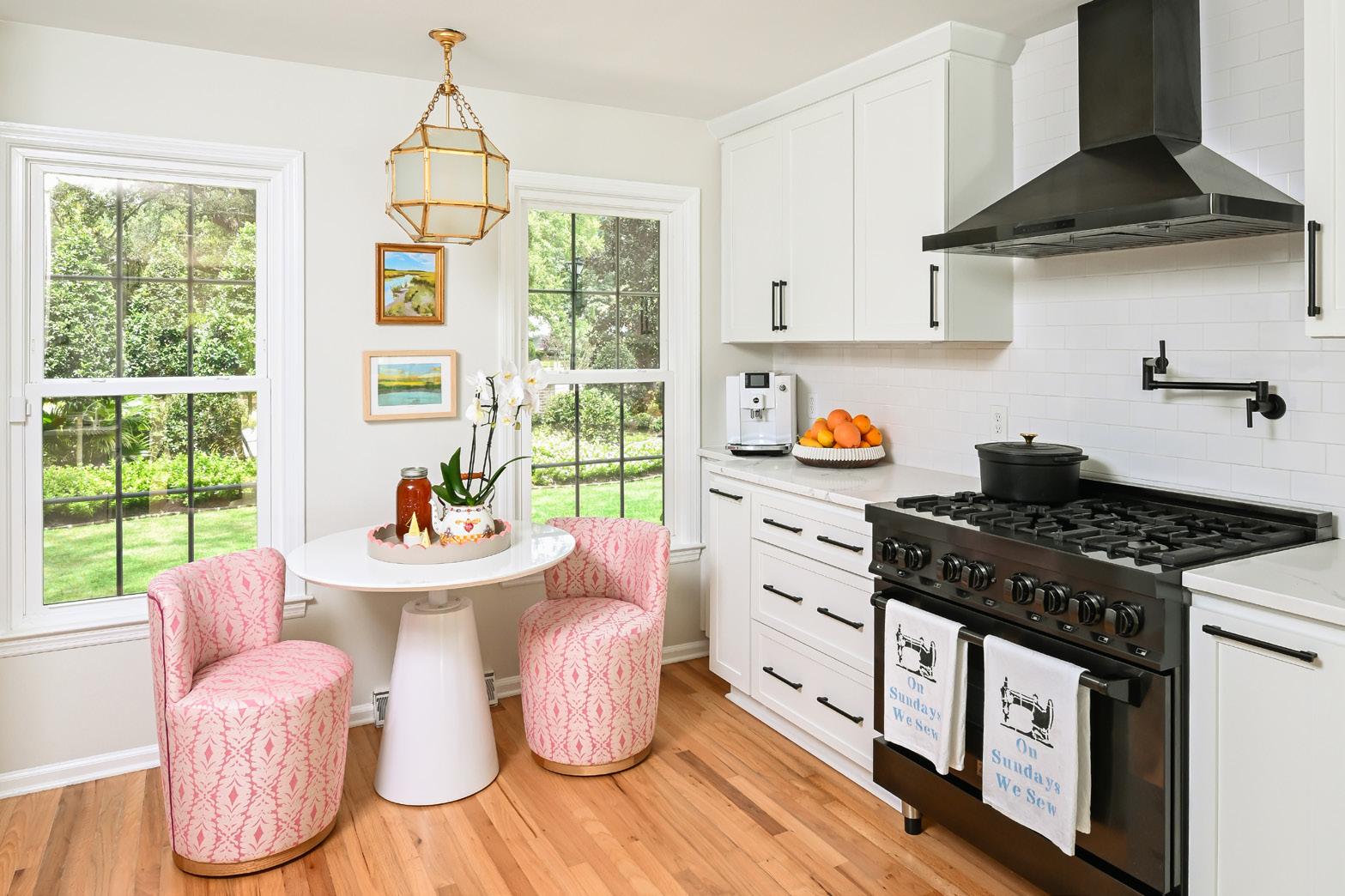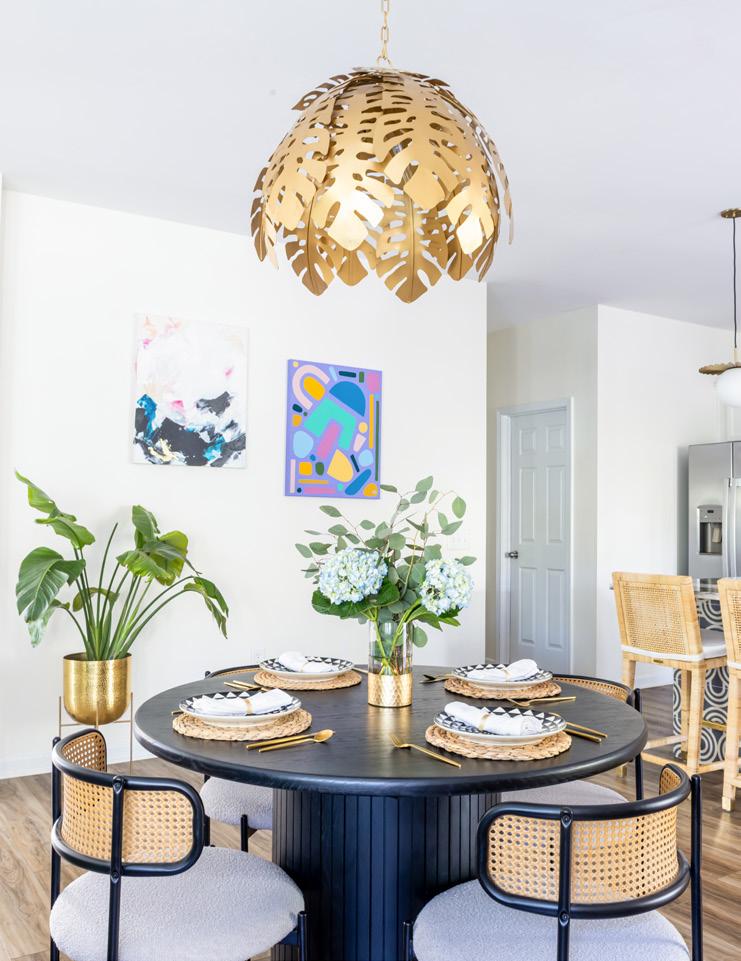 The dining area, nestled between the living room and kitchen, showcases a black breakfast table with a fluted base from TOV Furniture, surrounded by black chairs featuring rattan-accented backs. A contemporary light fixture from GG's on Maybank hangs above, perfectly centering the space. Alongside, a rattan console table with graceful curves, also from Auden & Avery, introduces a fresh silhouette to the space. “This piece is one of my favorites in the home,” Andrea admits. Above, artwork by local artists such as Millie Sims, Jenan McClain, Julia Deckman, Sam Rueter, and Anne Rhett Photography, originally curated for her previous home, adds a personal and layered touch.