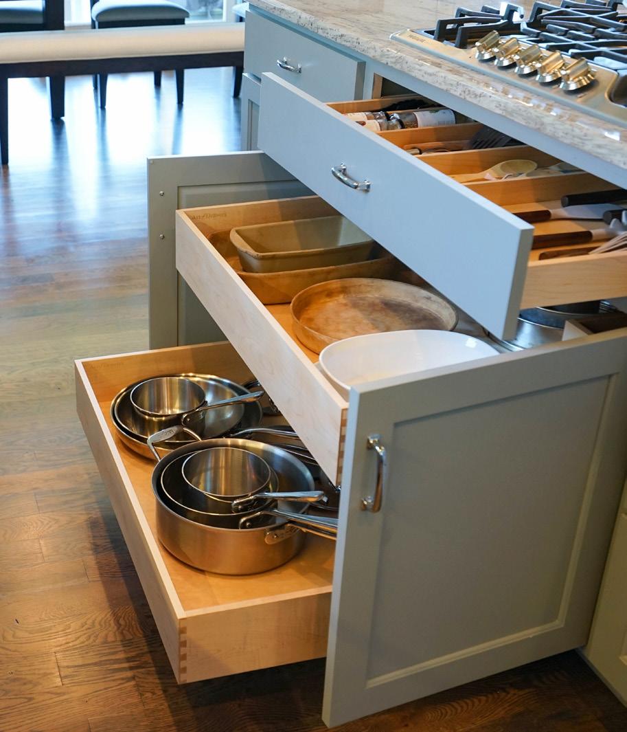 Customize your cabinetry with pullout drawers, gliders, and adjustable shelves. Consider including a beverage station or appliance garages to maximize surface space and increase accessibility.