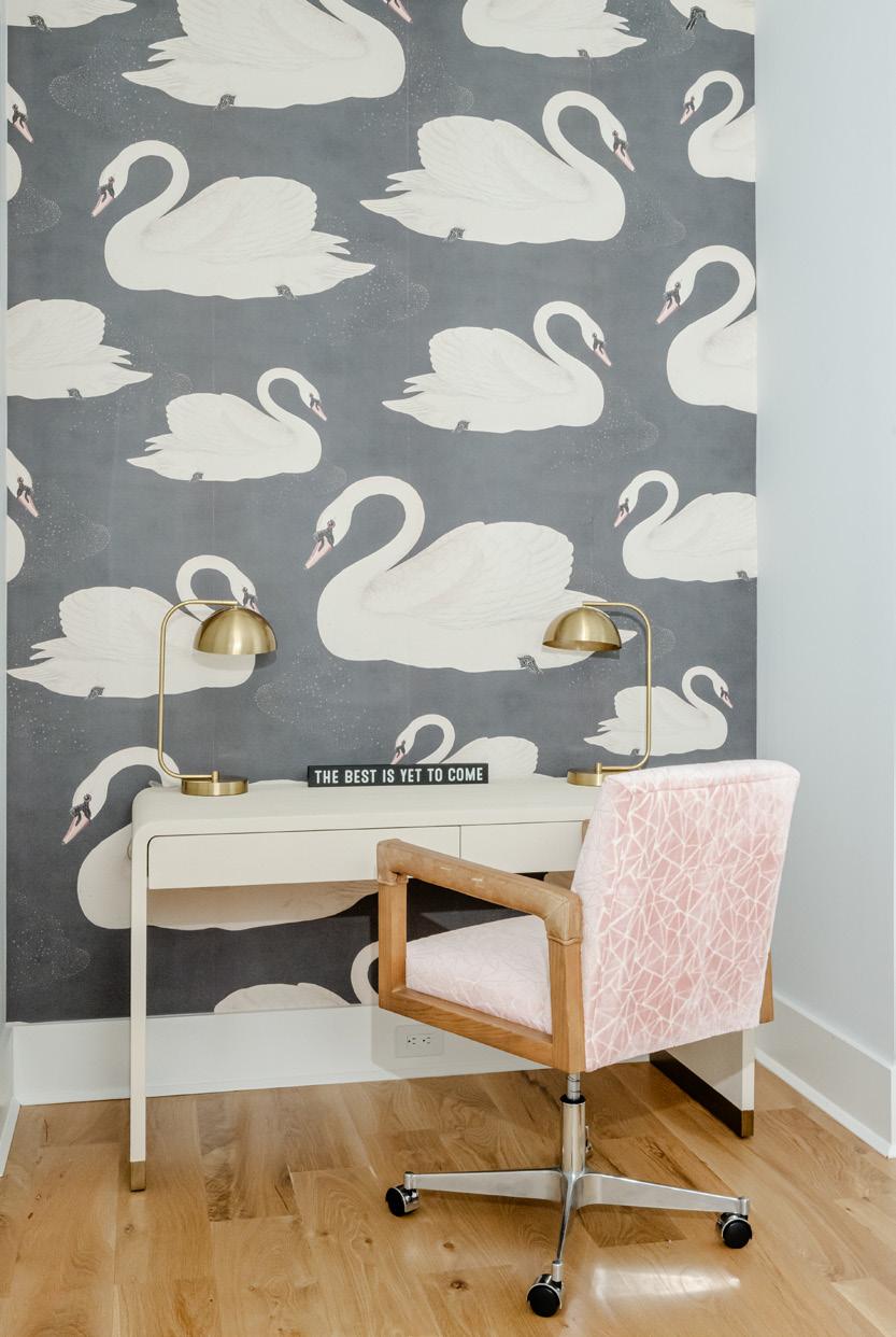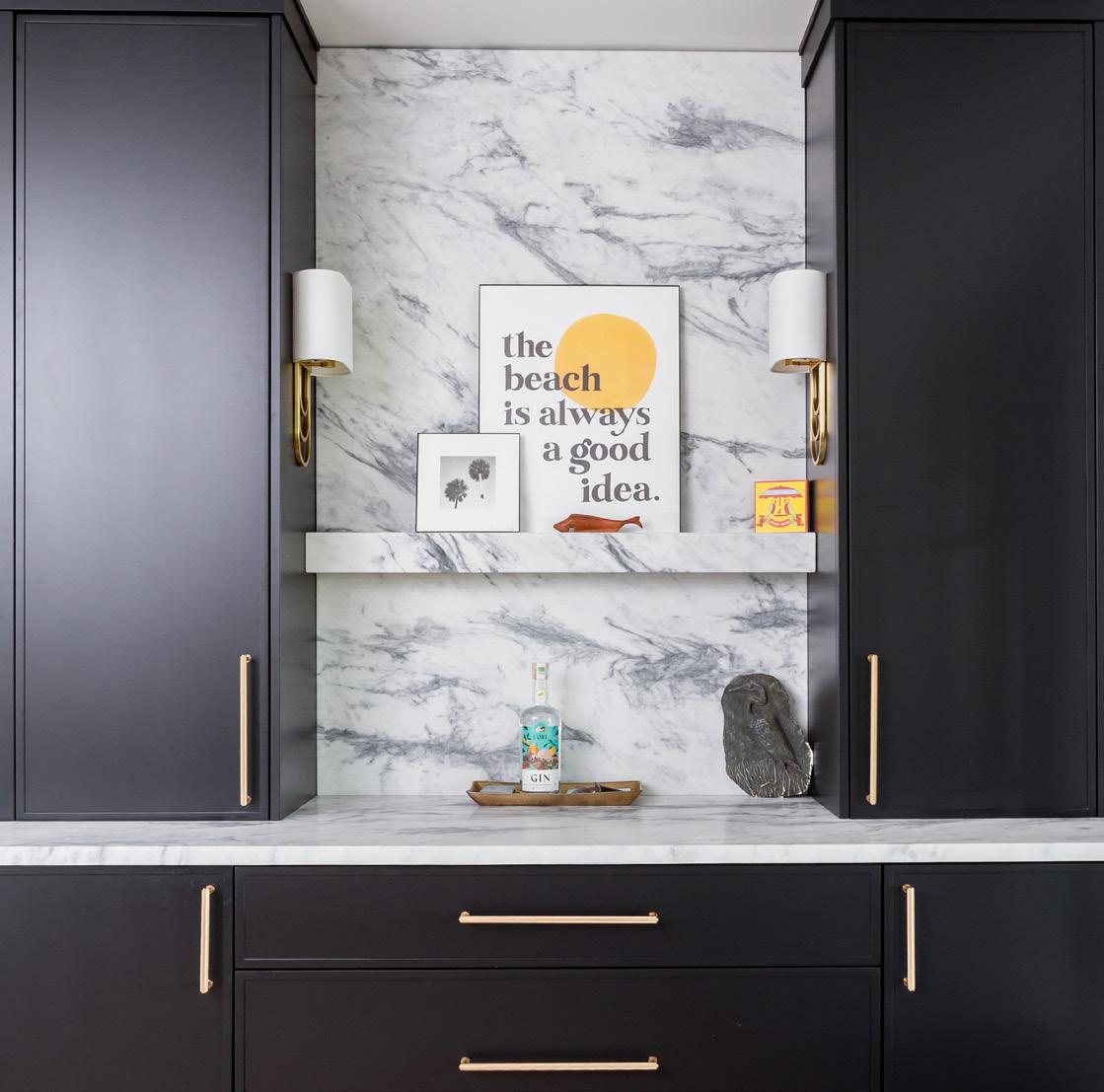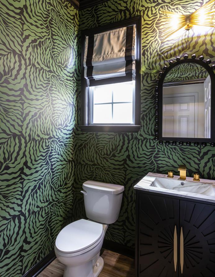 echo the color of the built-ins while infusing the space with a playful tropical vibe. The light fixture from GG's on Maybank and mirror from Auden & Avery pairs beautifully with a sleek sink cabinet from Wayfair. “We really go for it,” Andrea says. Black-painted trim and ceiling heighten the drama, giving the small space a big impact. “To have this much space is incredible. This move has been more than a physical expansion; it’s been a mental one as well. I’ve experienced so much growth, both personally and professionally. I can’t say enough about how much I love our new home. I truly do,” Andrea says.