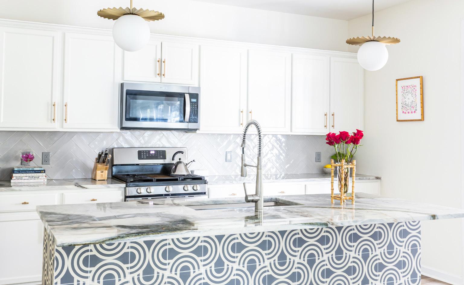 The kitchen required only subtle updates, yet a single change brought a striking impact: a custom tile backsplash that now envelops the island, replacing the rustic shiplap that once stood in its place. The tile, sourced from Clay Imports in Mexico, was chosen from a mood board Lissette created, inspired by the vibrant spirit of a Hispanic restaurant. Woven rattan barstools from Auden & Avery and sculptural rounded fixtures from Shades of Light complete the composition, infusing the space with warmth, rhythm, and a touch of modern elegance.