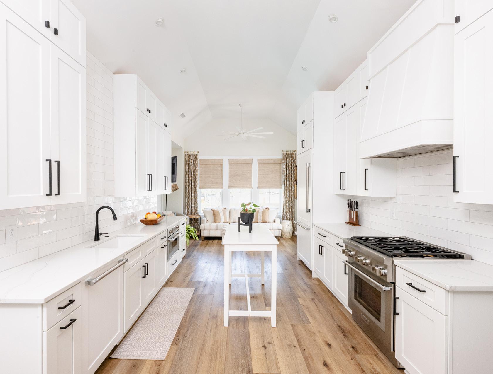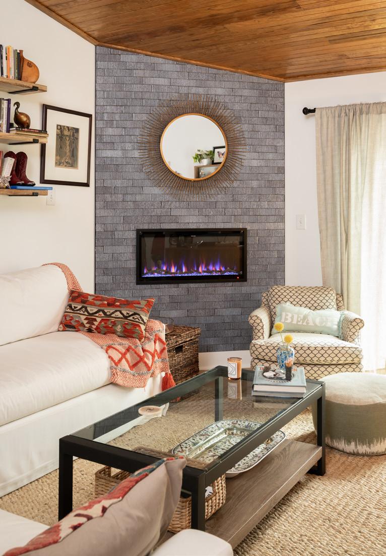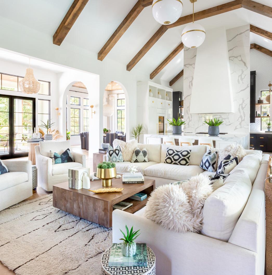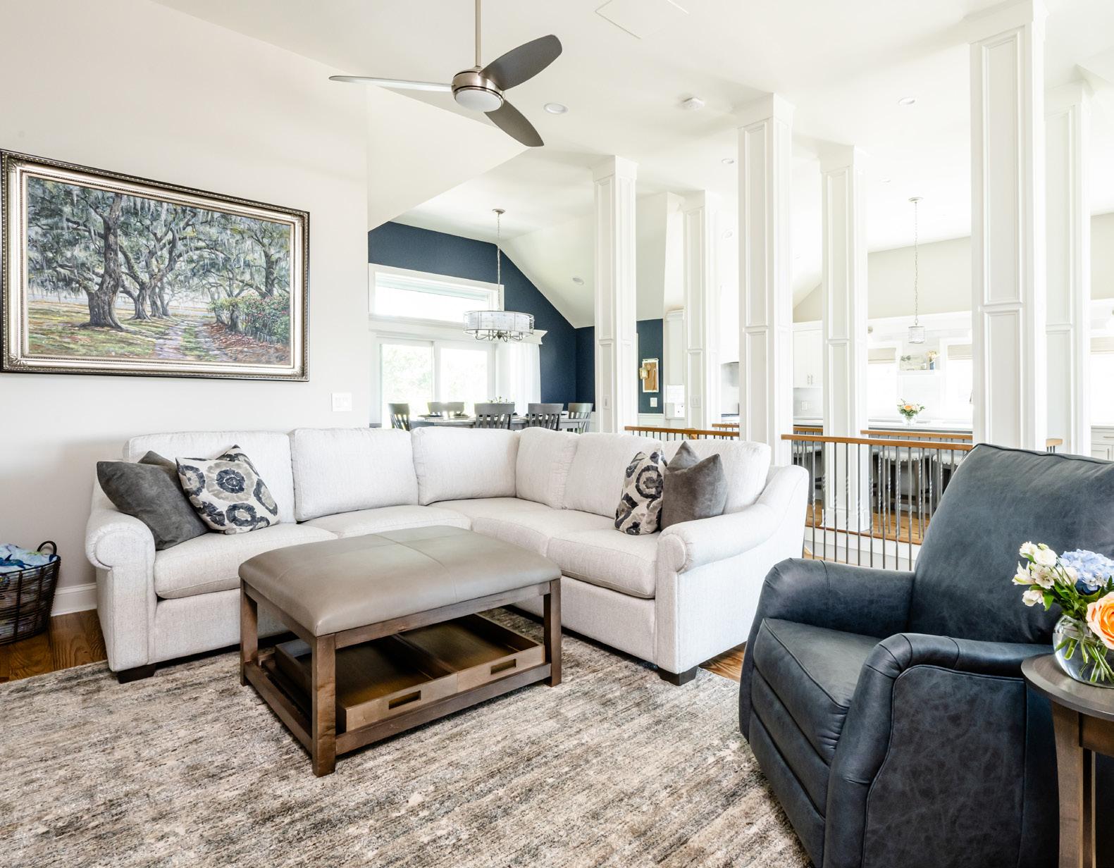 Layer your living space with textured accessories, such as rugs and pillows, for added family comfort and visual depth. Performance fabrics allow this pet-friendly home’s sofa to remain white. Designed by Jen Elkins of Bliss Designs Furniture and Accessories by Steven Shell Living, stevenshellliving.com