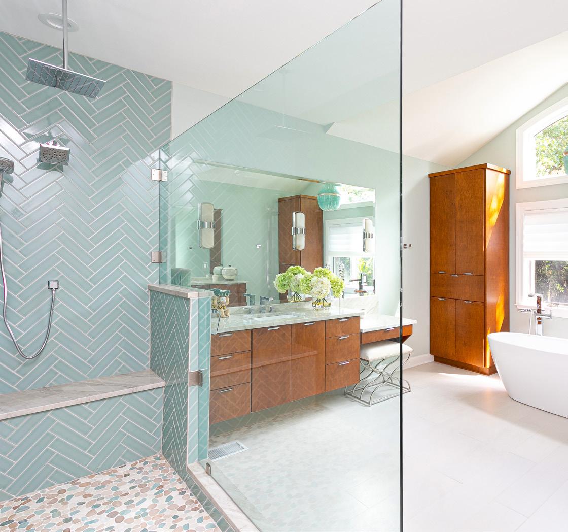 Soften a bathroom with sea-glass tiles in a herringbone pattern, paired with pebble flooring for a natural, spa-like feel. Balance the cool tones with warm wood cabinetry and a statement light fixture to tie it all together.